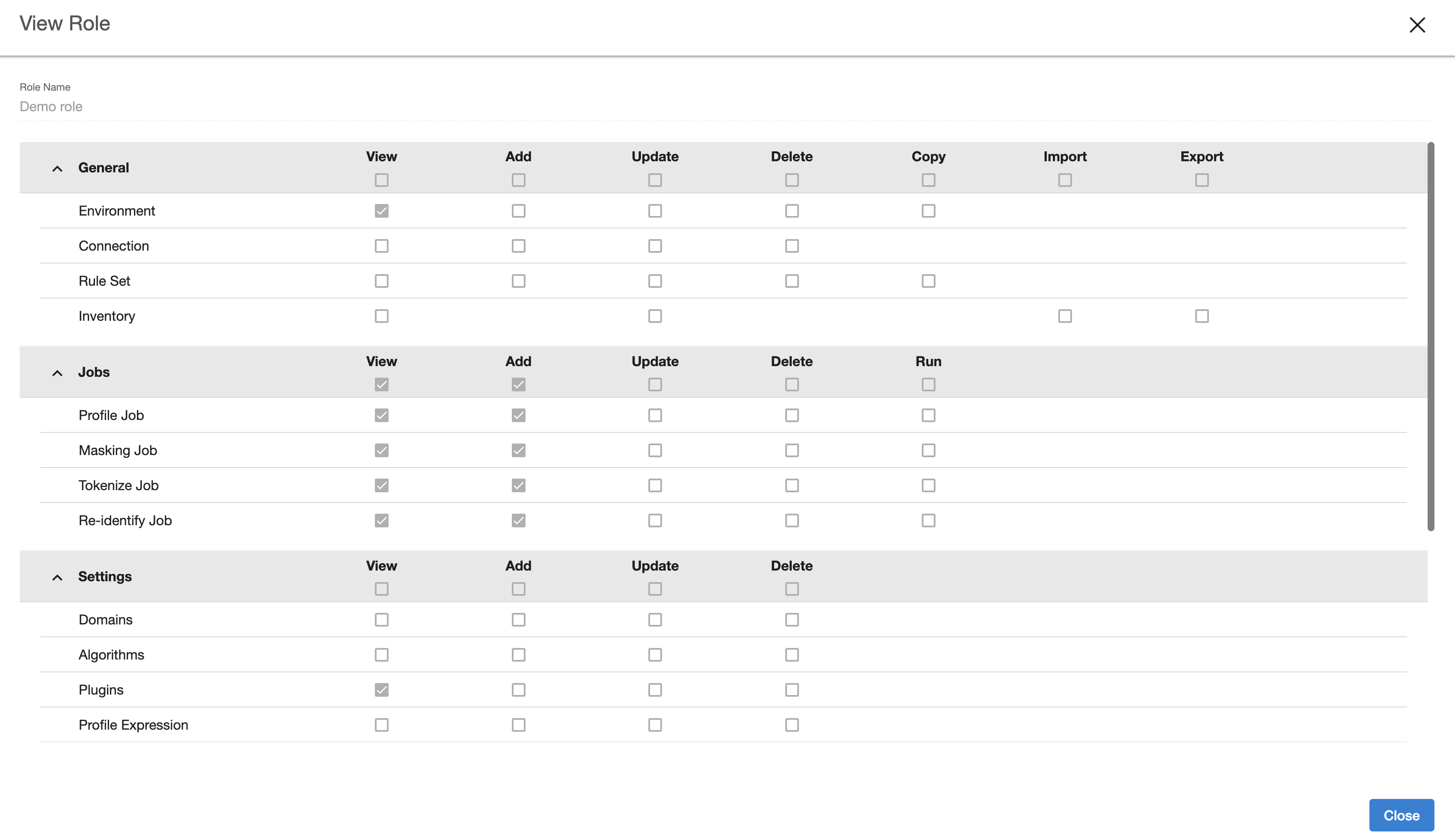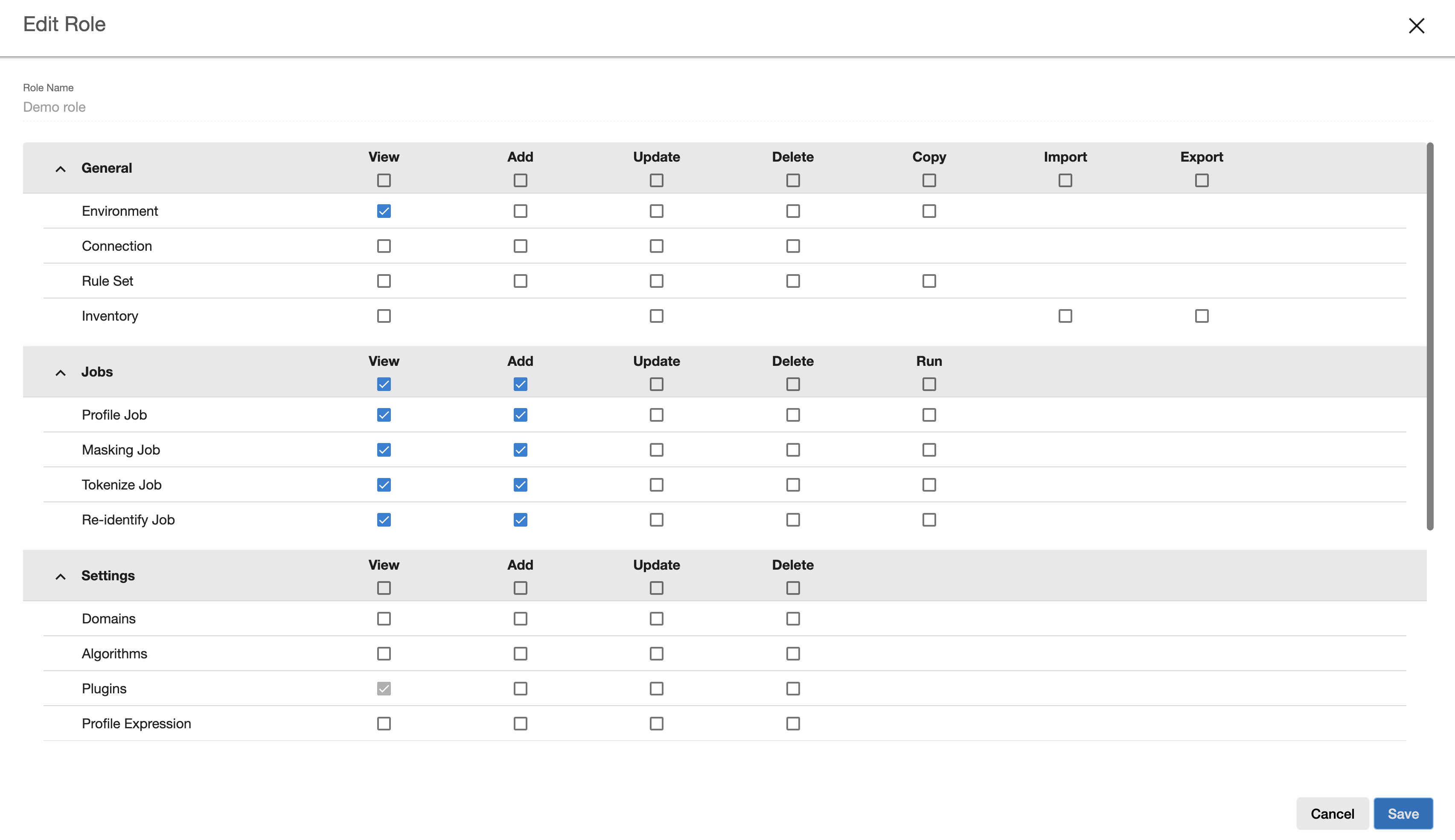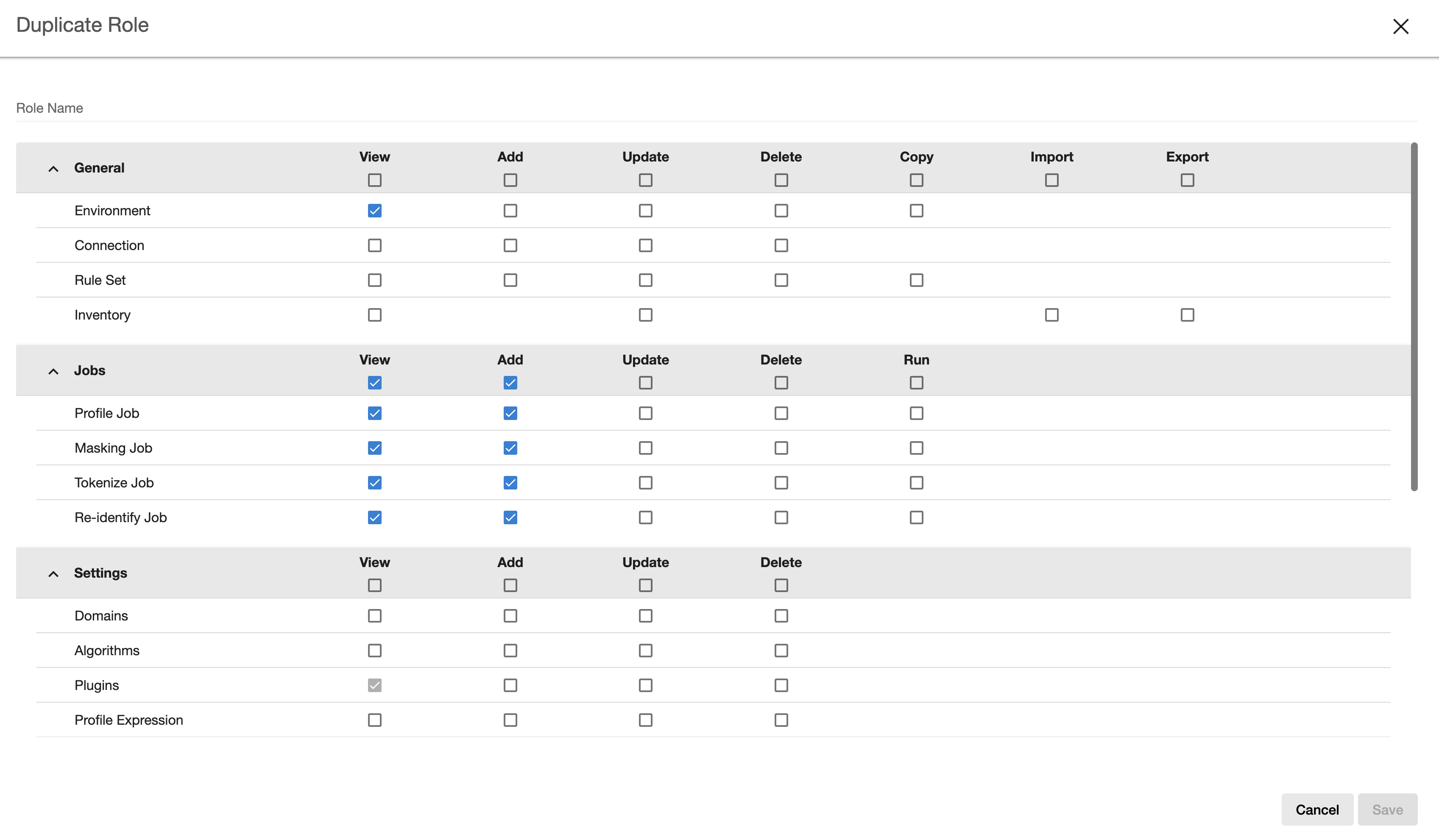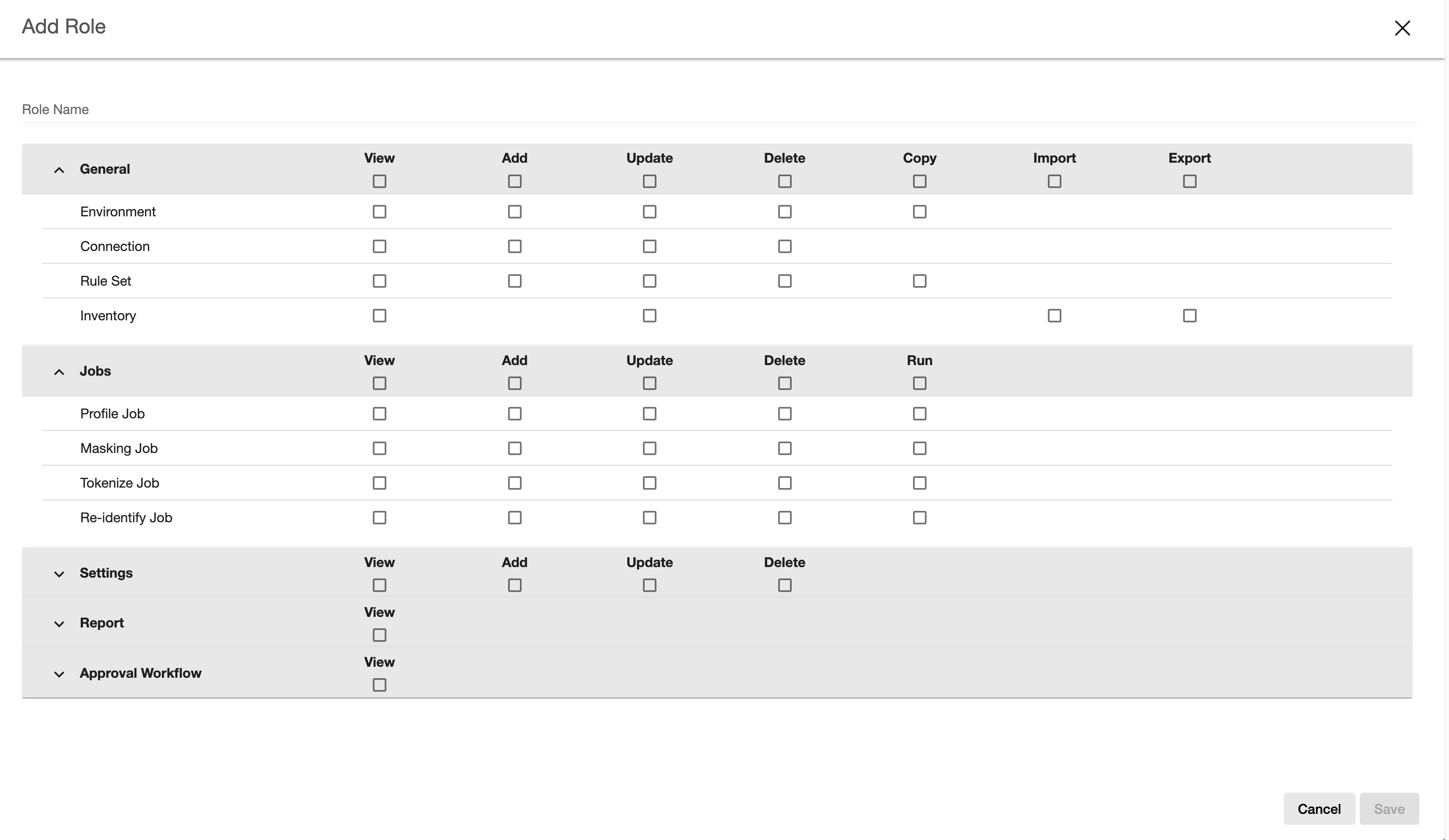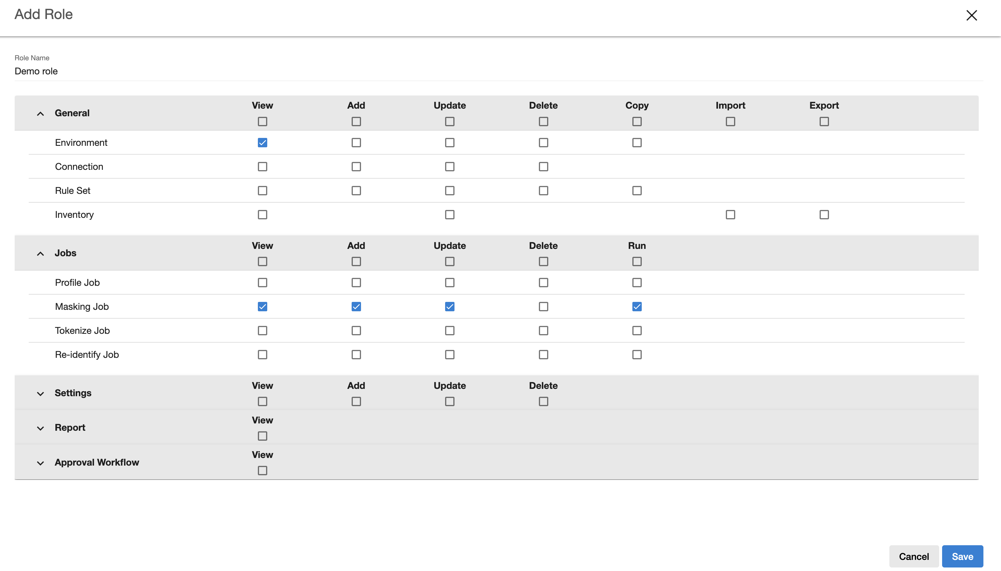 Select the checkboxes for the corresponding privileges that you want to apply. If there is no checkbox, that privilege is not available. For example, if you want this role to have View, Add, Update, and Run privileges for masking jobs, select the corresponding checkboxes in the Masking Job row.