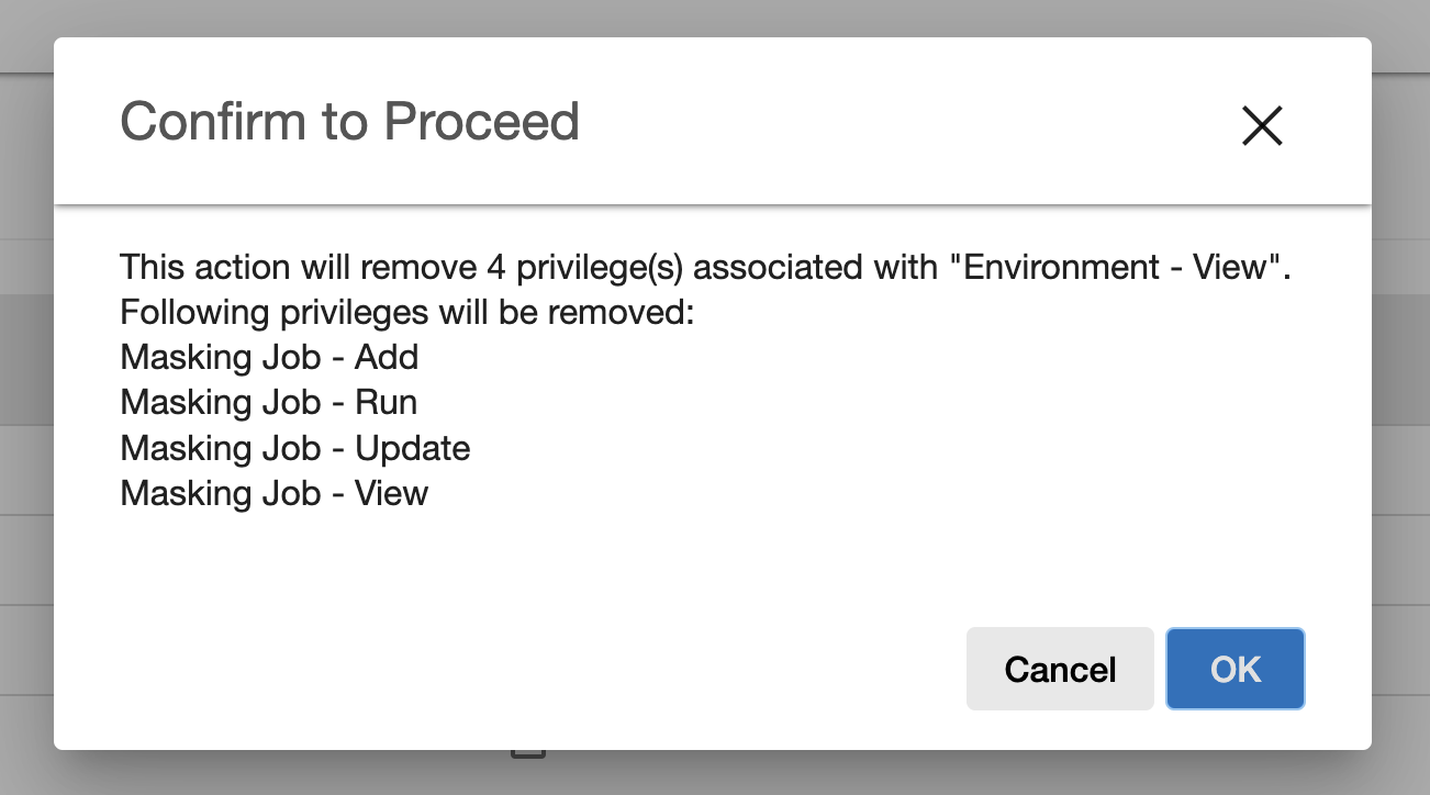 For example, Masking Job [ View, Add, Update, Run ] depends on Environment - View. So if the user tries to remove Environment - View then it will ask for confirmation to remove it with the list of dependents. If users do not wish to remove it then they can select the Cancel or Close icon else can select OK and move forward with changes.
