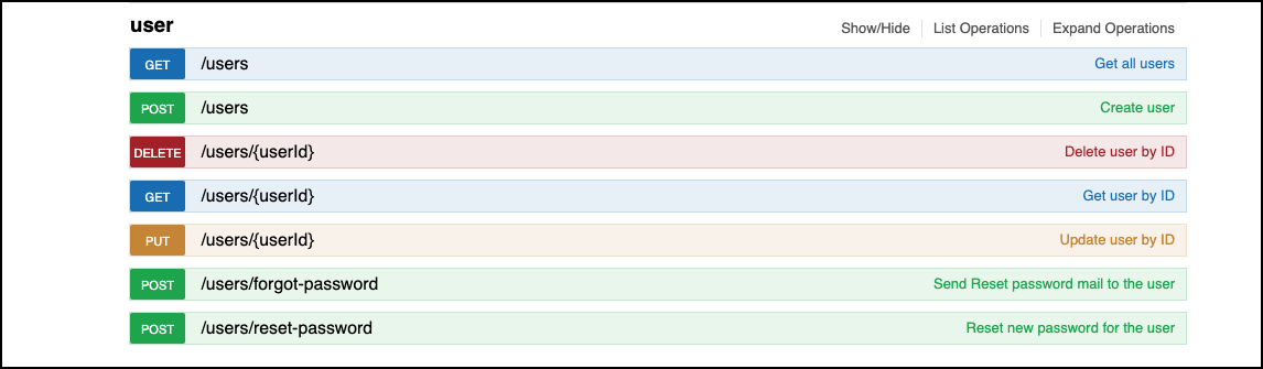 Click Create users at the upper right of /users section and refer to the Example Value for parameters required for new users.