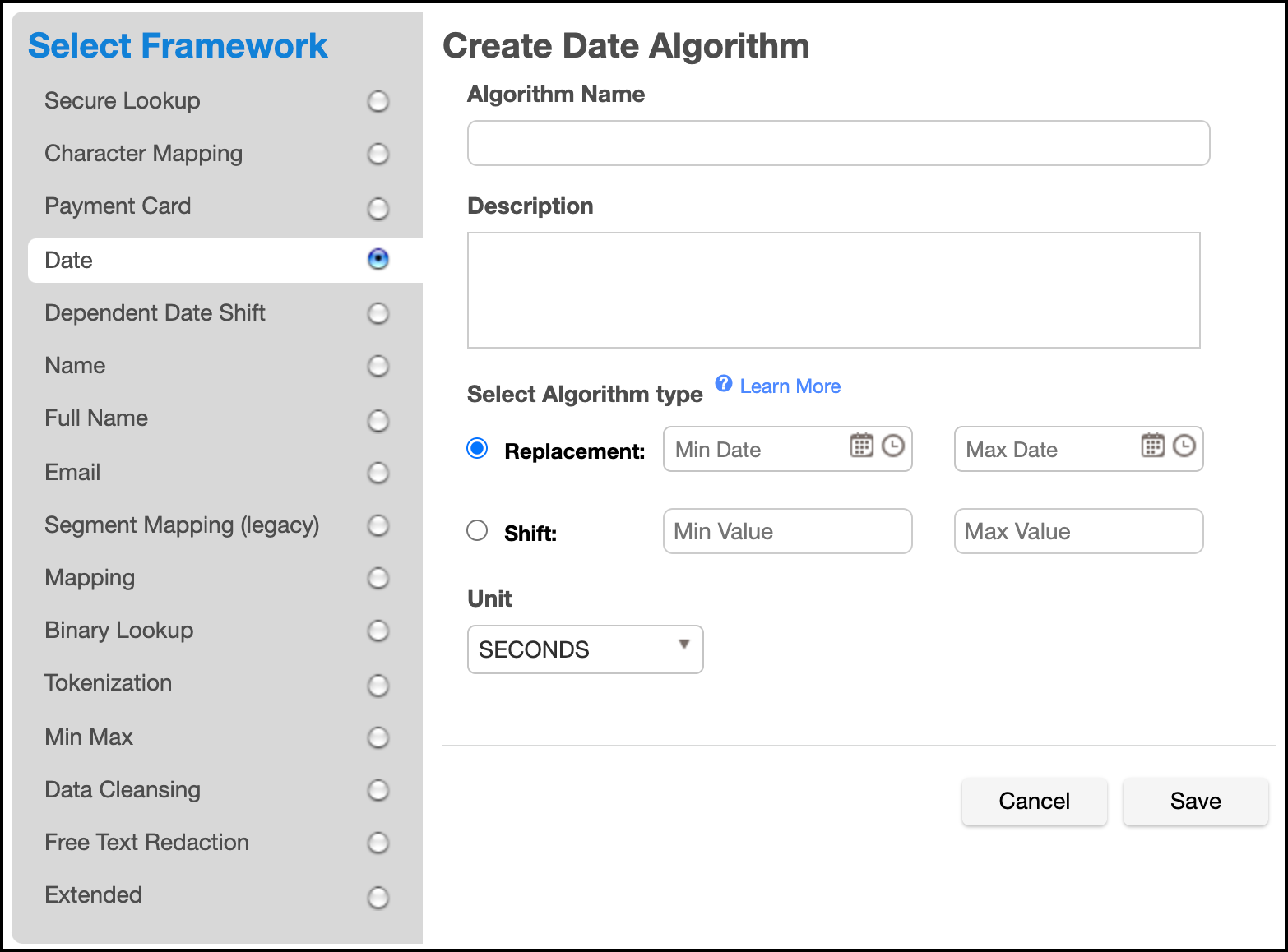 For information on creating Date Replacement algorithms through the API, see API Calls for Creating Algorithms - Date Replacement.