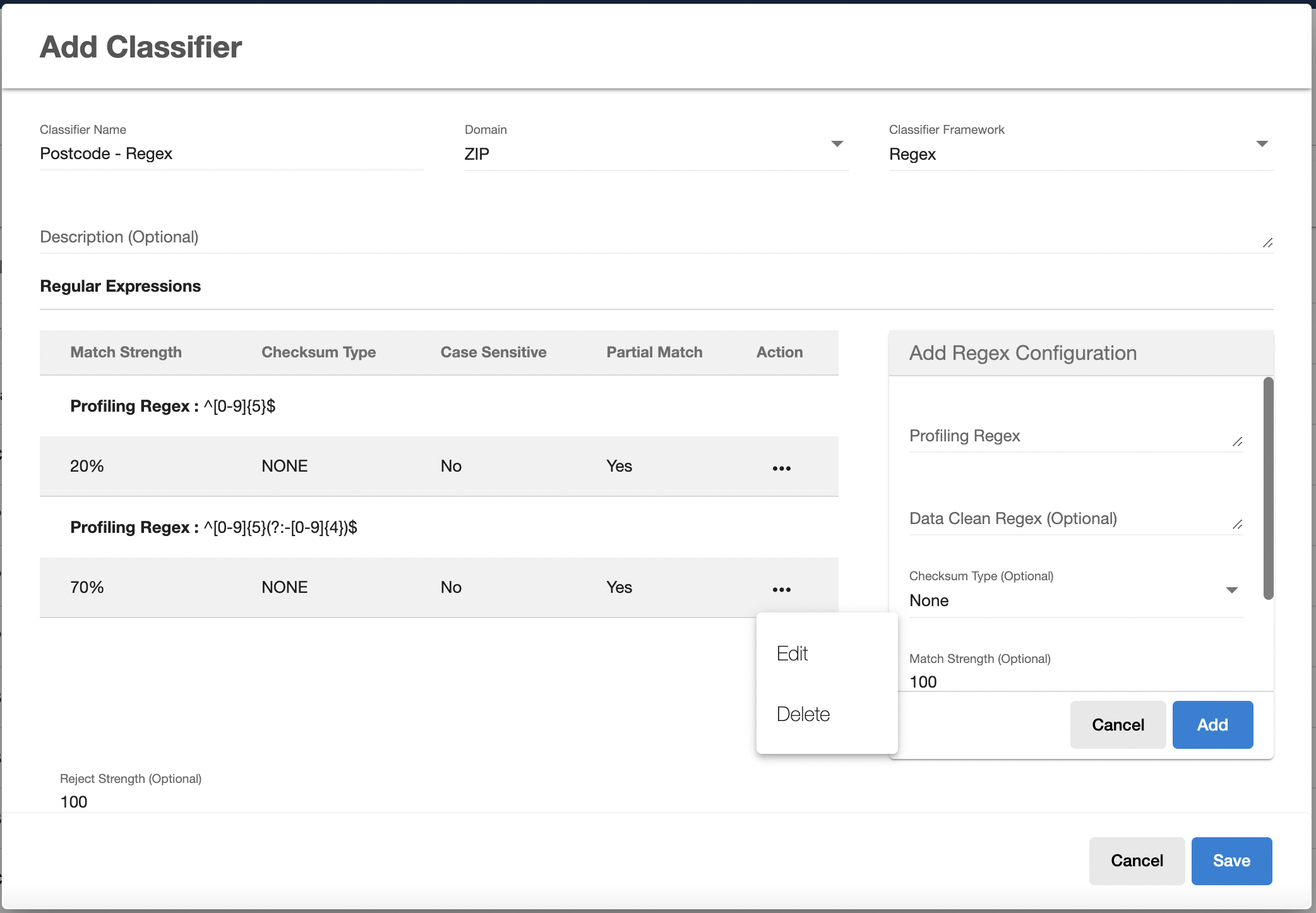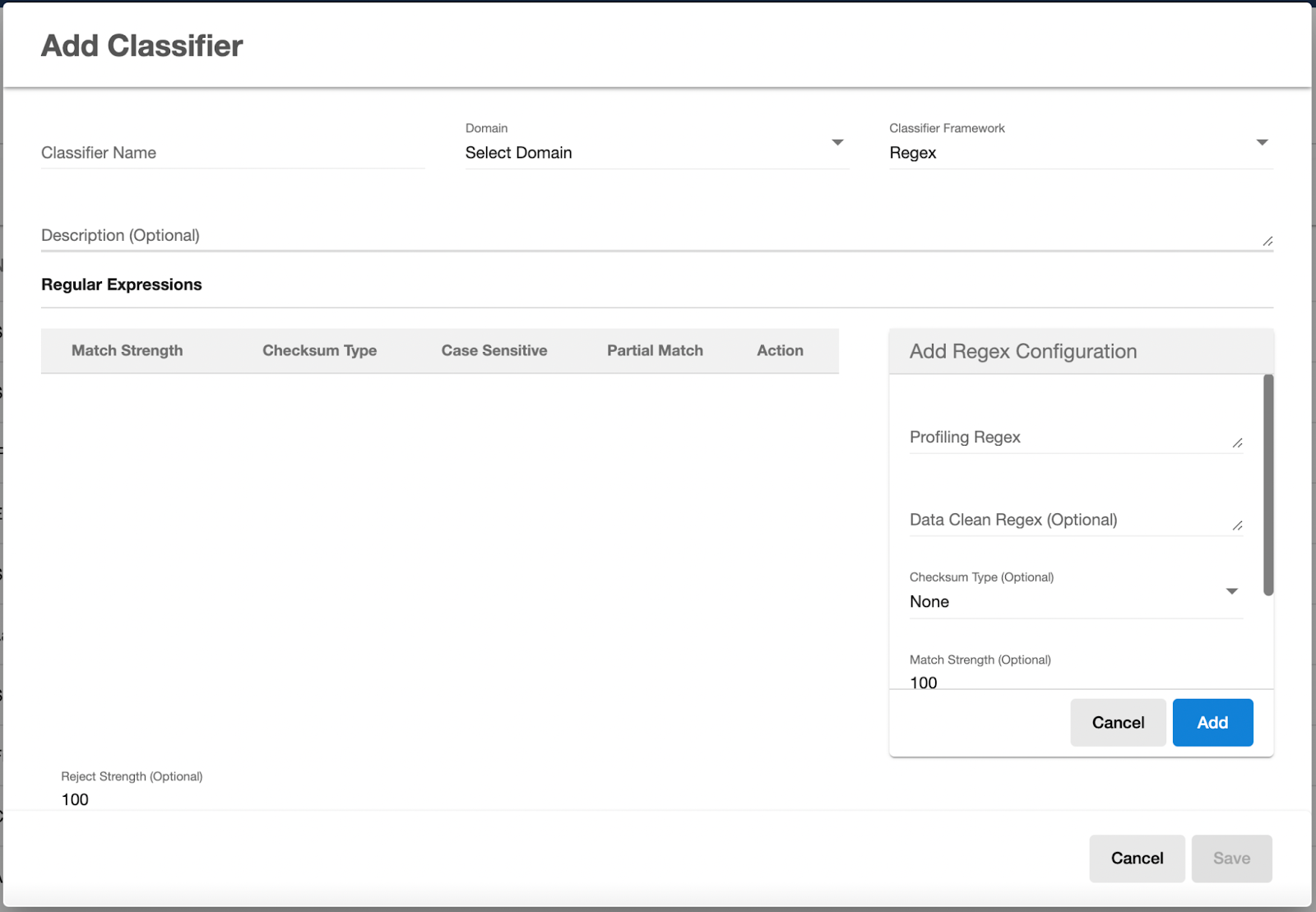 The reject strength for classifiers applies any time there is no match. For example, if a REGEX classifier contains 4 regular expressions, each expression would be tested against the column data value, and if none match, the reject strength defines the result. For this reason, it can be useful to add a pattern that matches quite broadly, even if it's not particularly selective for the domain in question, with a low match strength. This prevents a full rejection for values that might match this classifier's domain as well as one or more other domains.