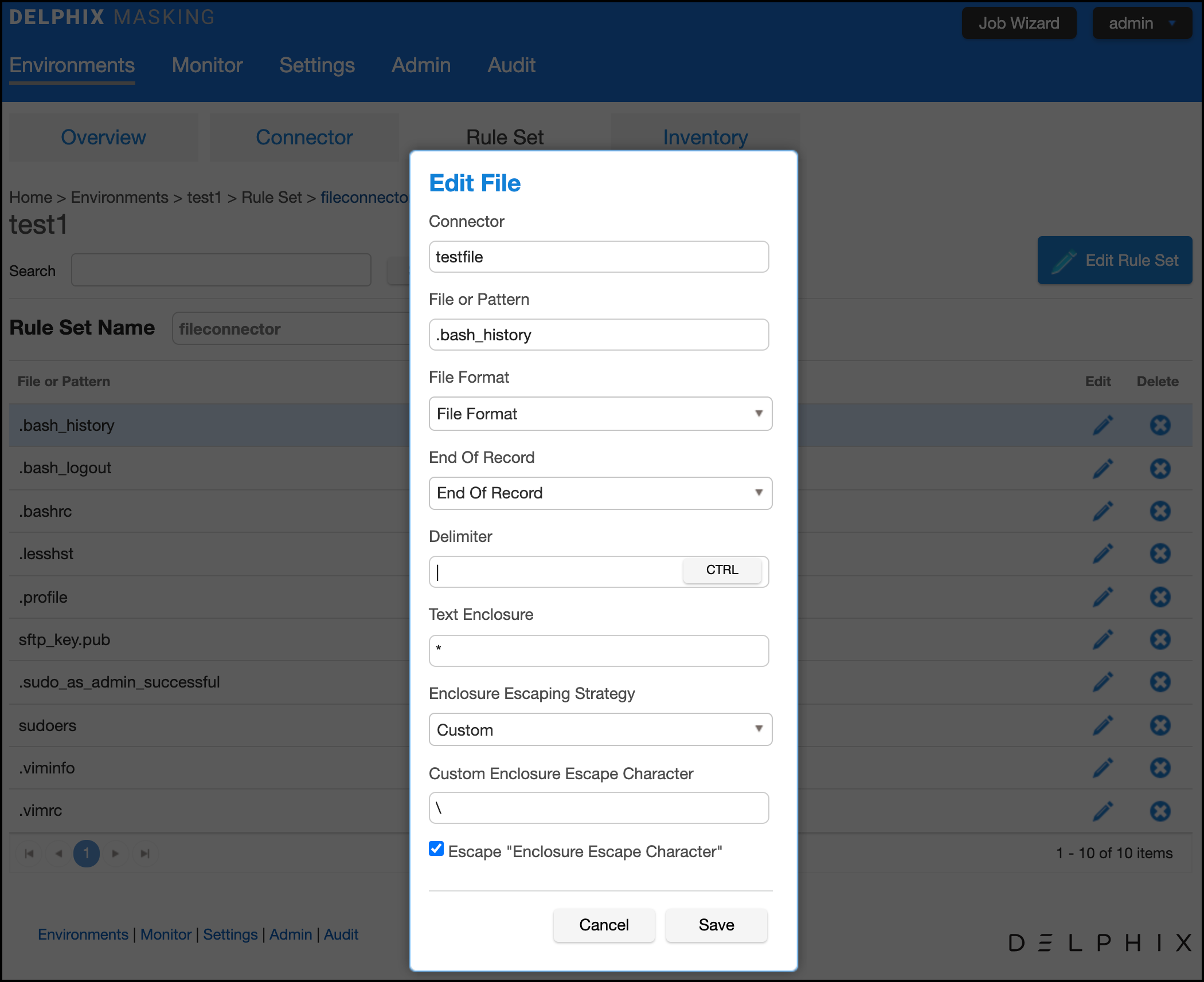 The user can configure the enclosure escape character from the UI/API to escape the enclosure. To configure the enclosure escape character from the UI, user needs to select the "Enclosure Escaping Strategy" dropdown value as per below options on the edit ruleset popup window,