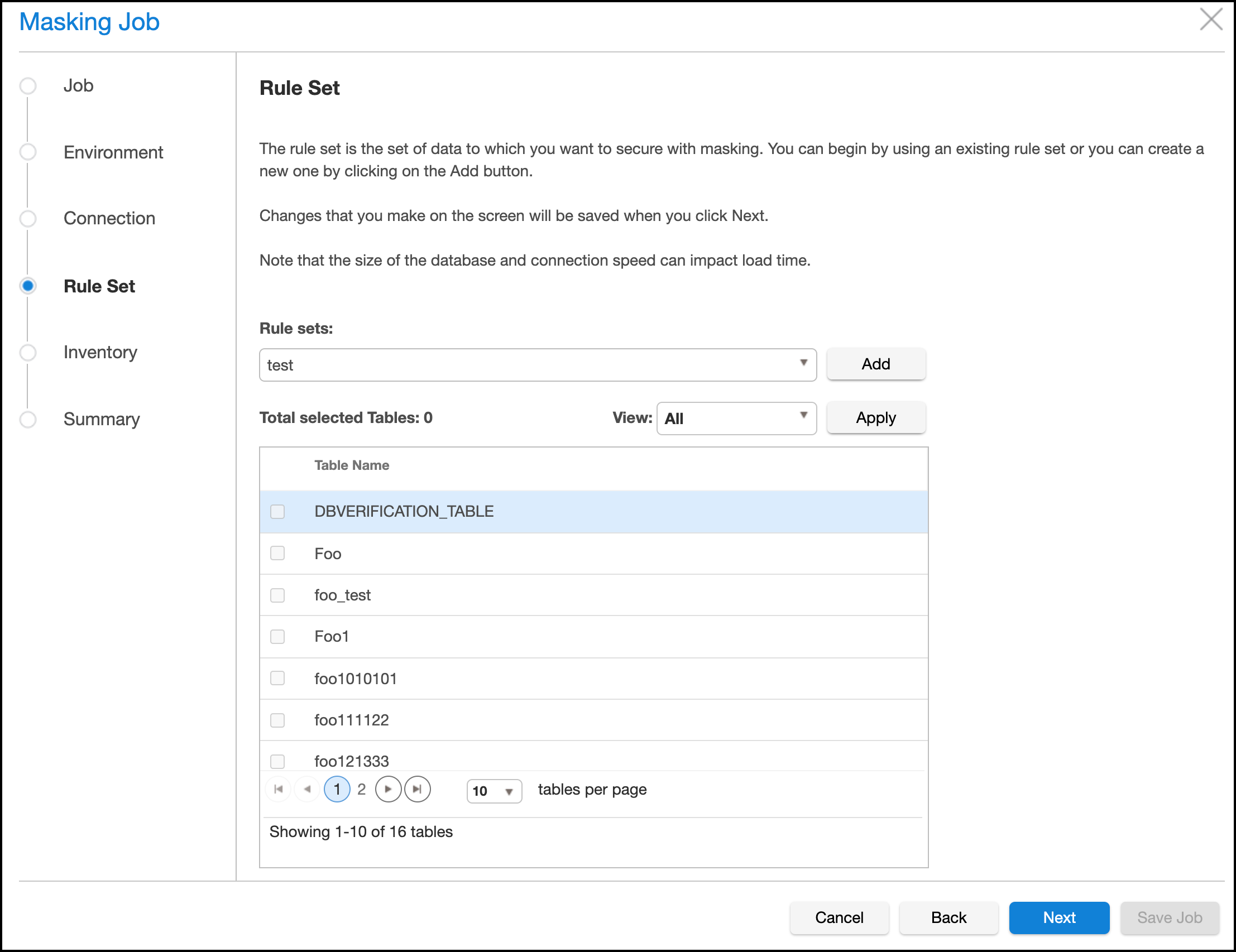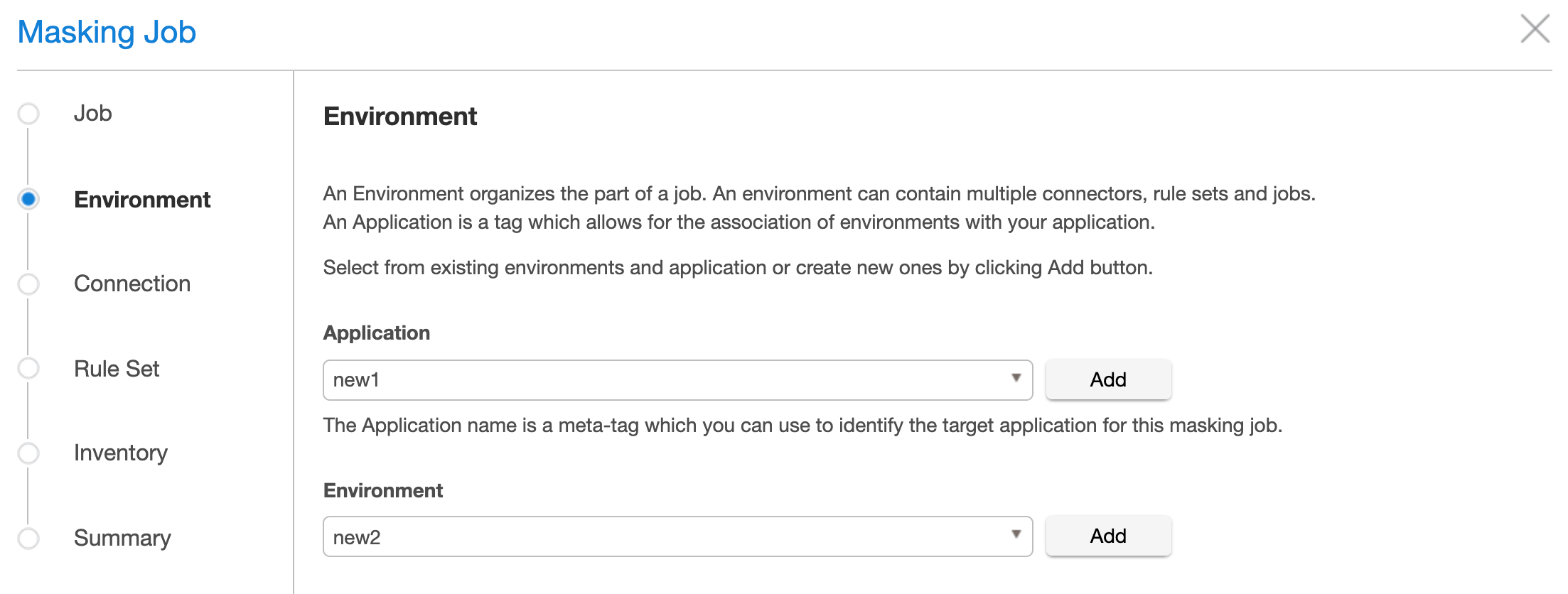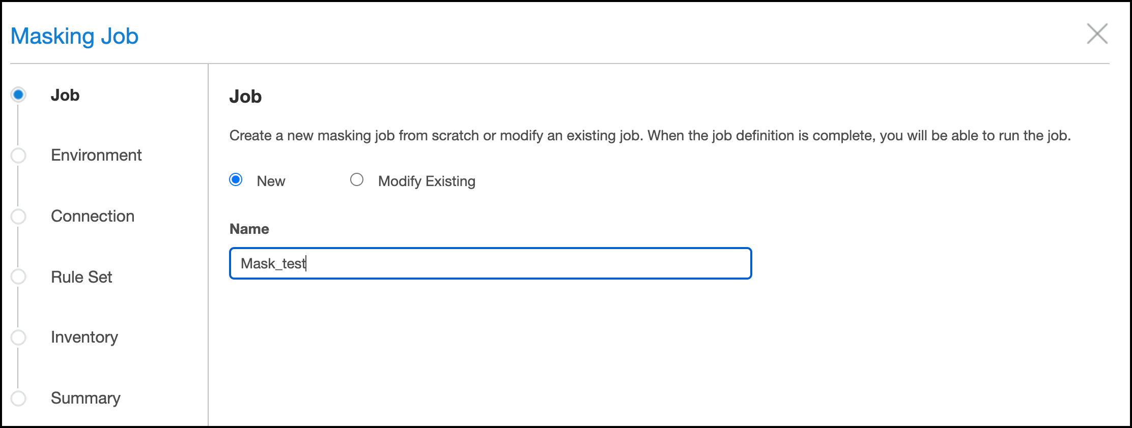 The Job Wizard makes creating a new masking job much easier by guiding you through the process. You can create new objects or choose to use existing ones that have already been defined. When creating a new masking job, the Job Wizard follows this sequence:
