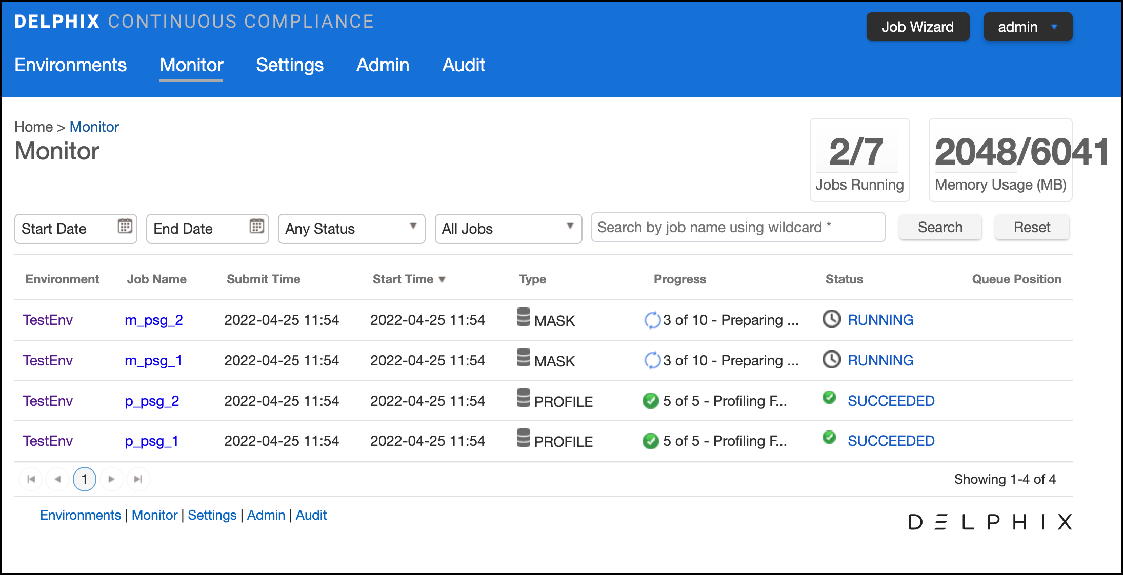 On the Monitor screen, you can perform a search to view the status of all the masking jobs executed. Use start date, end date, any status, all types, and search bar field to filter the search query as per your requirement.