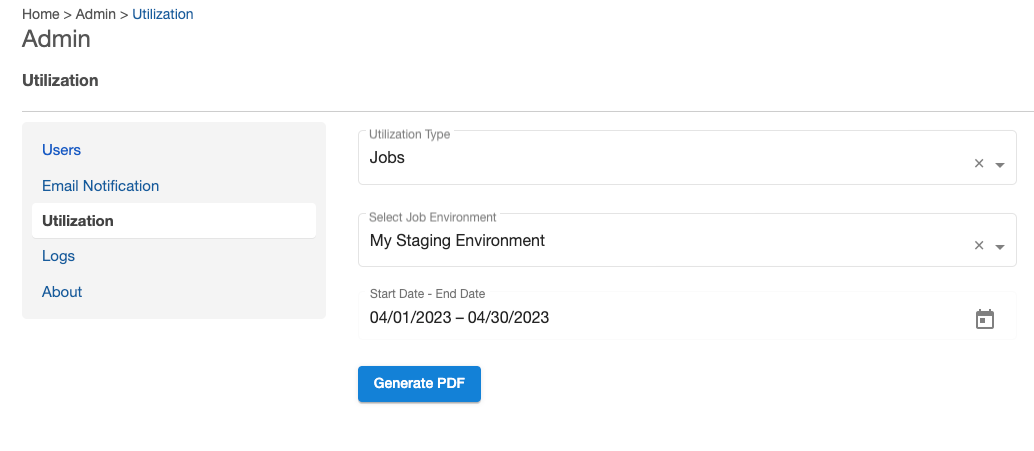 The Utilization page can be found in the UI under the Admin tab. This page provides the user the capability to generate two types of utilization reports in PDF format: