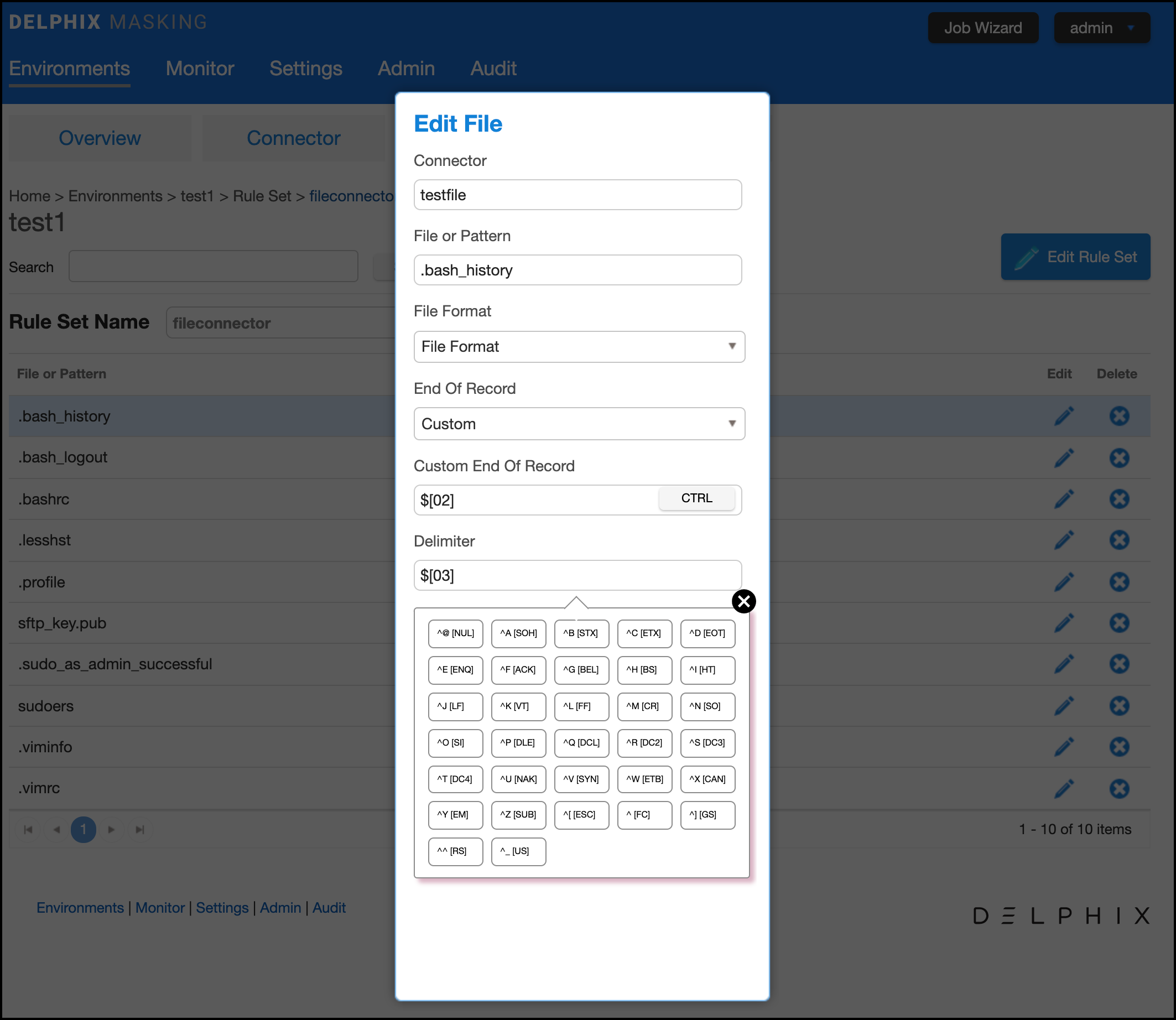 The user can specify control character as a delimiter/end of record from UI/API.