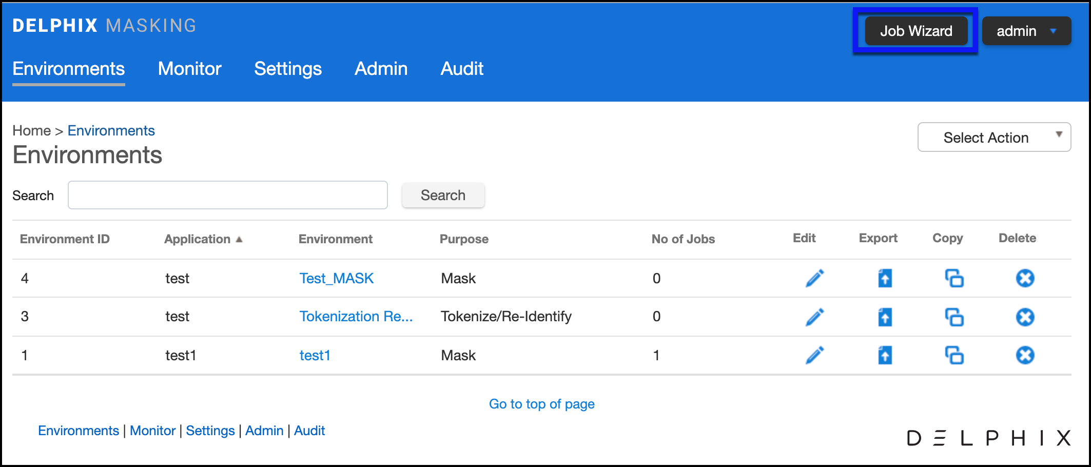 To use the Job Wizard from the masking application, click the Create Job button in the upper right-hand corner, as highlighted in the screenshot below.