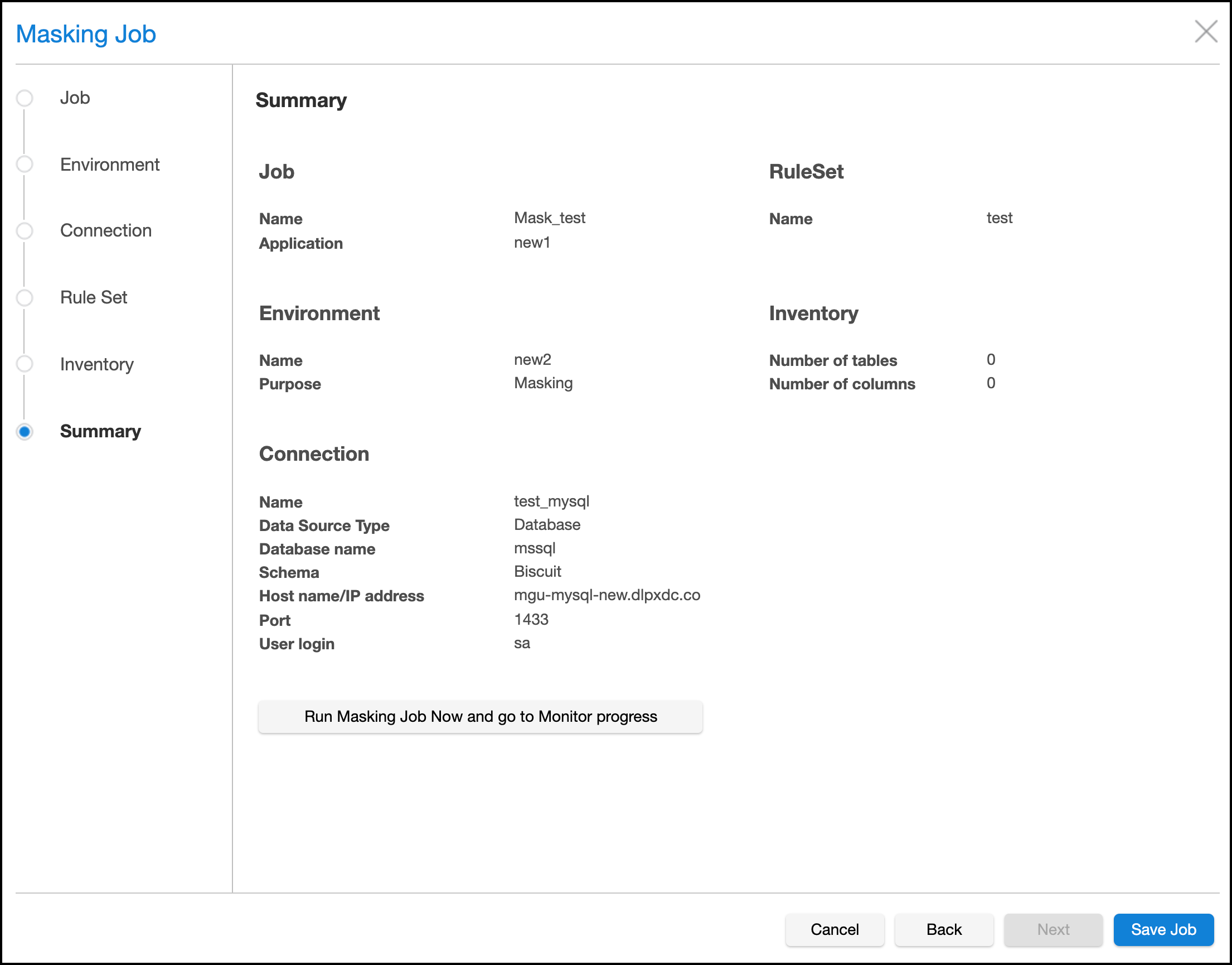 The masking job is saved when you click either Save Job or Run Masking Job Now and go to Monitor progress and a success message is returned on the Summary screen.