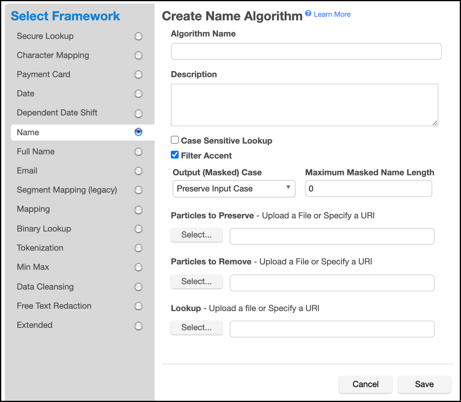 Choose Name Framework. The Create Name Algorithm pane appears.
