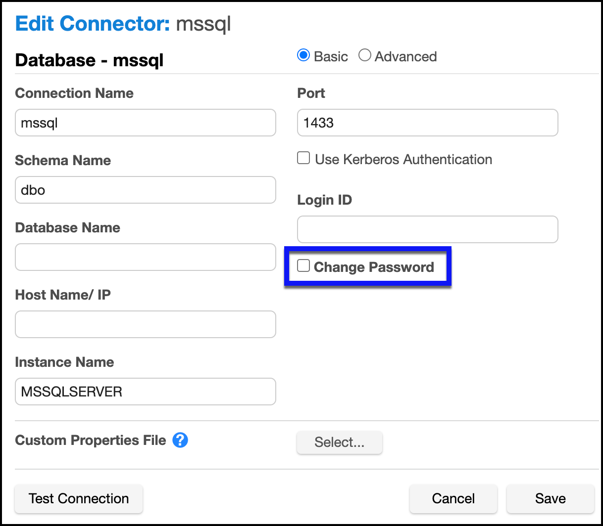 Several of our connector types offer two different modes of connecting, Basic and Advanced Mode. Advanced Mode gives you the ability to specify the exact JDBC URL and add parameters that may not be available in Basic Mode.