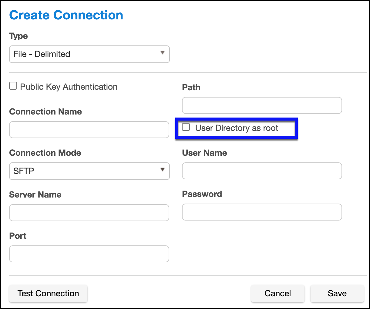 Starting version 6.0.9.0 the SFTP mode is extended with the 'User Directory as root' flag. If the Path defined is relative to the User-home-dir as configured on the SFTP Server, tick the flag below.
