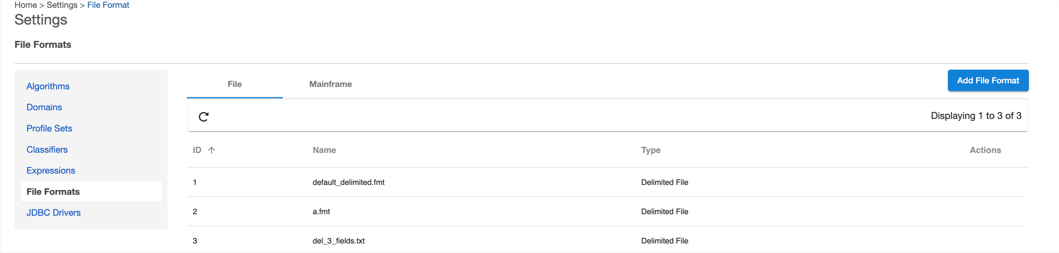 Unlike databases, files typically do not have built-in metadata to describe the format of the fields in the file. This must be provided to Delphix so it can update the file appropriately. This is done through the Settings tab, where a menu item is available on the left for File Formats. Select File Formats to see tabs for File and Mainframe and an option to add a format.