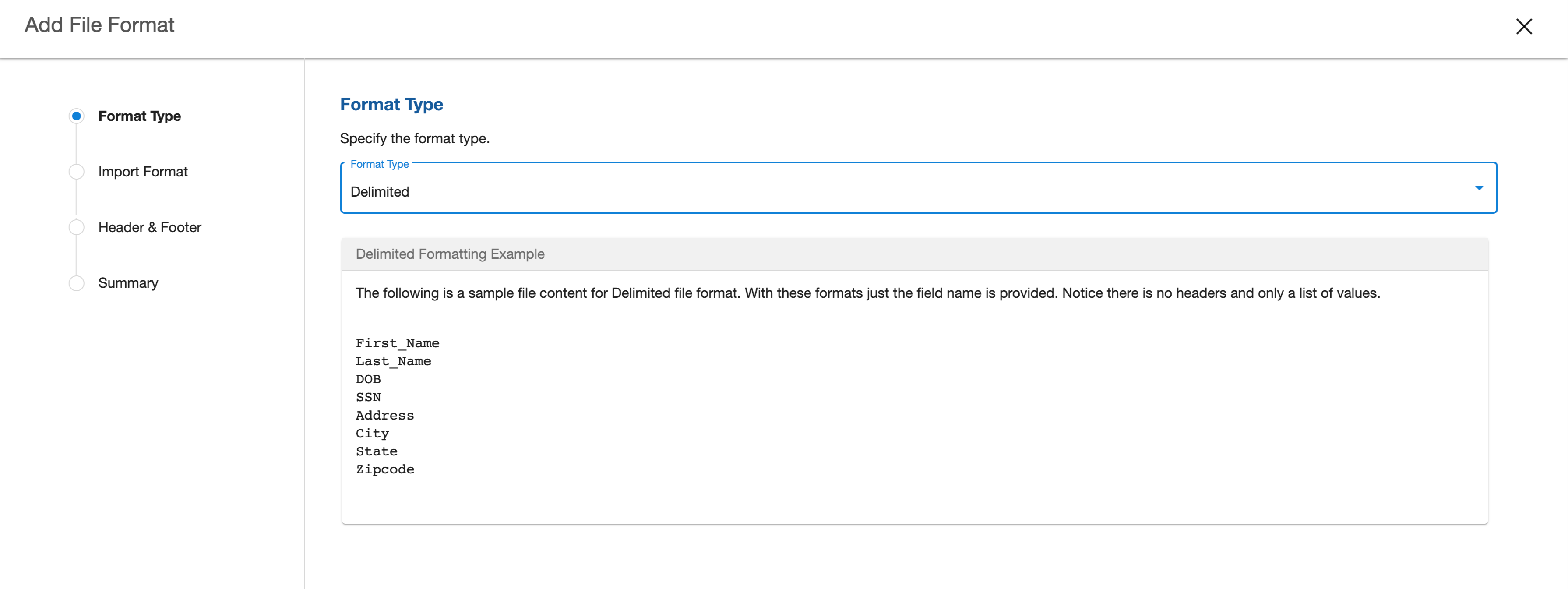 For other file types, you can also import the file format with the Add File Format button in the File tab, which will import the file directly into Delphix.