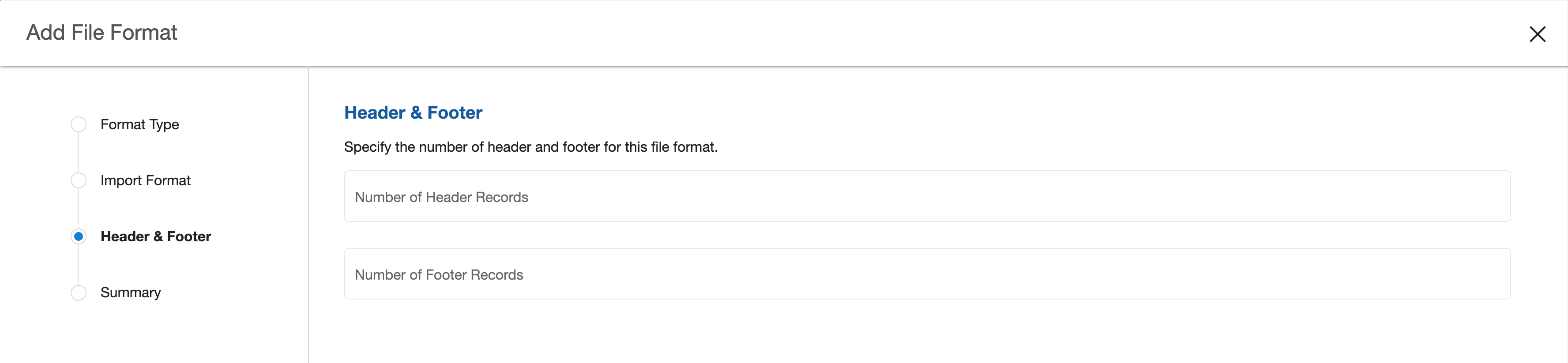 Optionally, for a format type of delimited file, or fixed-width file only, users will see a step to configure the number of header or footer records for the file. Click Next with or without setting the header or footer as needed.