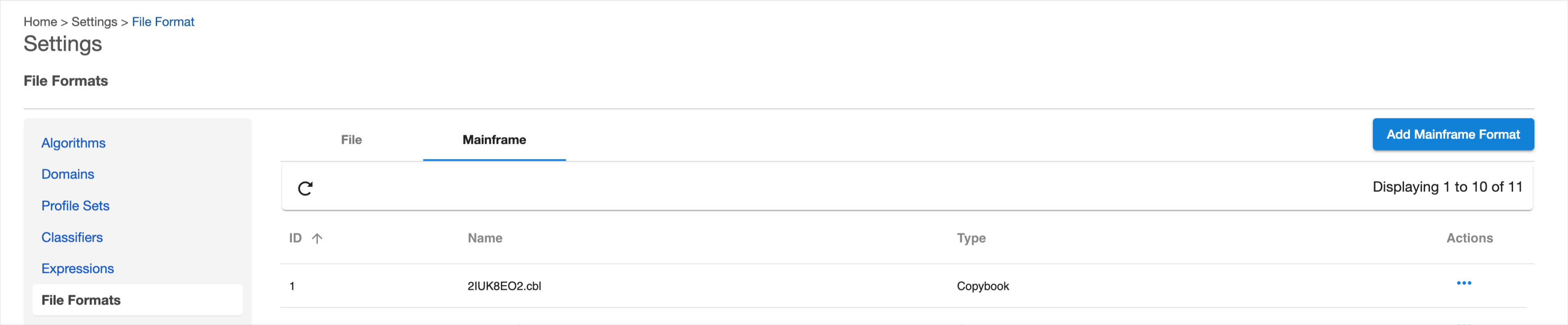 For Mainframe data sets, you can specify the format via the Add Mainframe Format wizard in the Mainframe tab, which will import the copybook directly into Delphix.