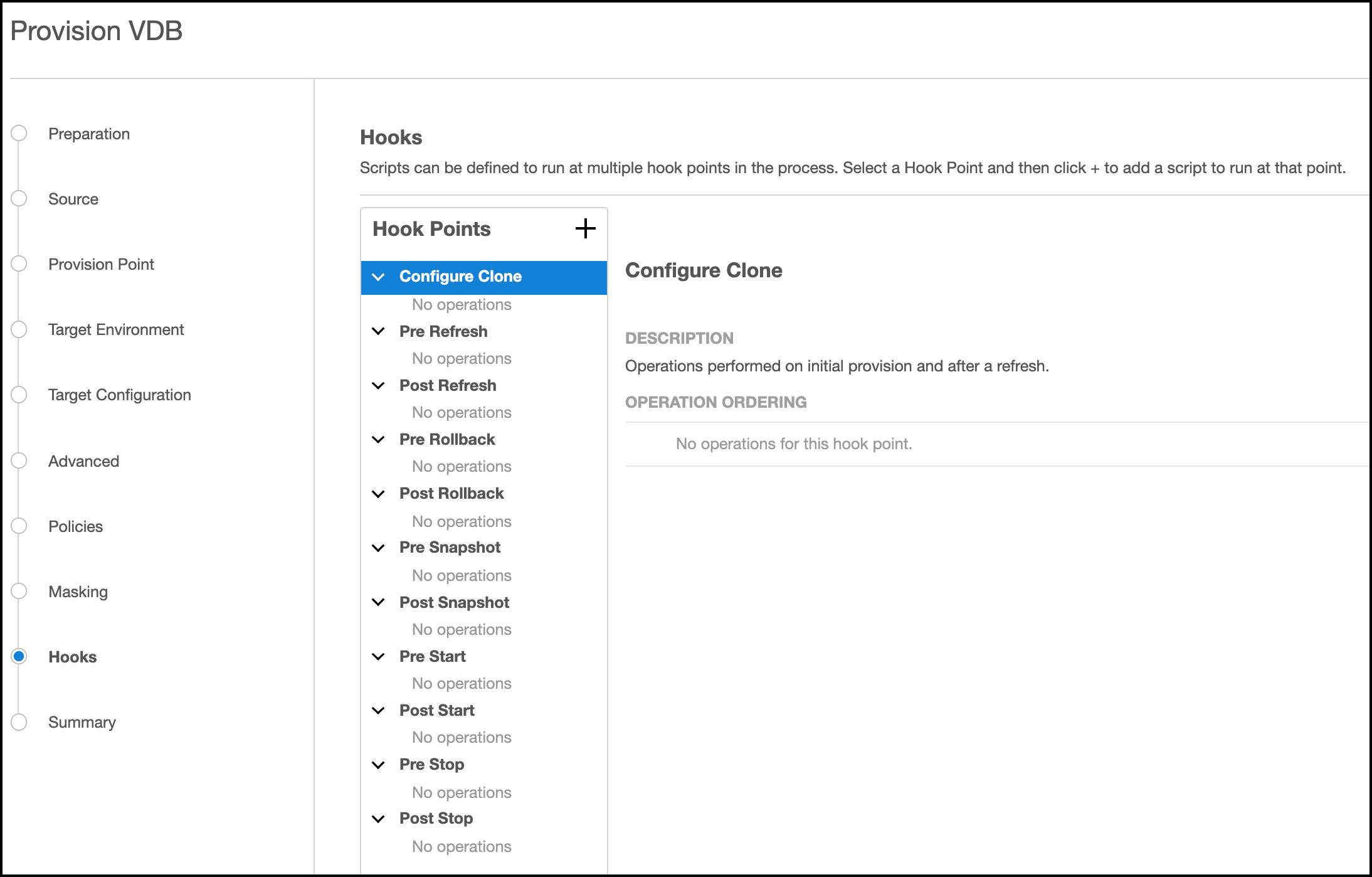 Specify any Pre or Post Scripts that should be used during the provisioning process. If the VDB was configured before running the masking job using scripts that impact either user access or the database schema, those same scripts should also be used here. Be sure to define the Configure Clone hooks to run the masking job if you choose to mask using a script(s) in the Masking step.