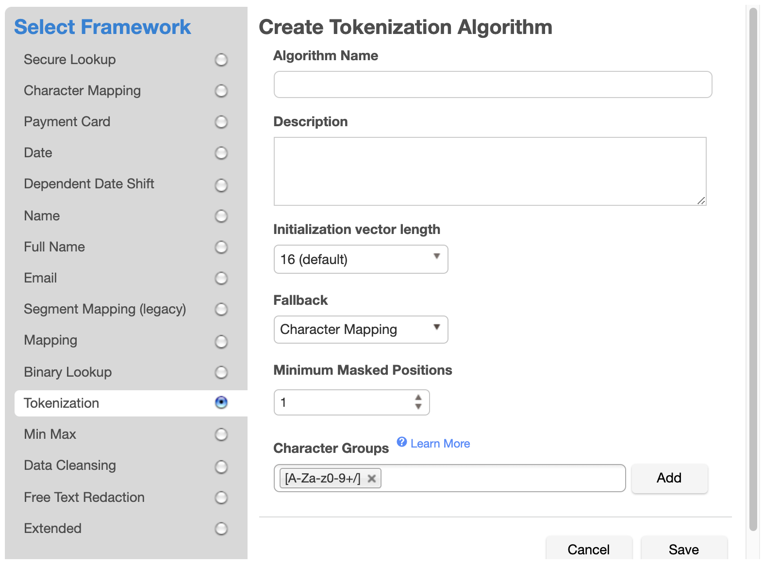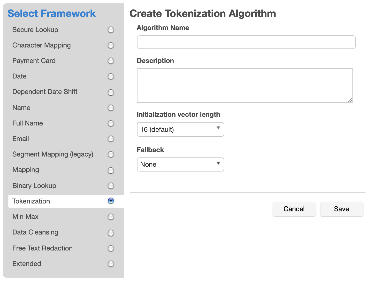 Select the Tokenization Framework. The "Create Tokenization Algorithm" pane appears.