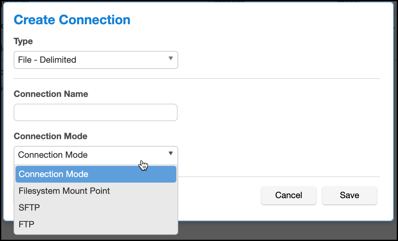 Connection Mode— Filesystem Mount Point, SFTP, and FTP