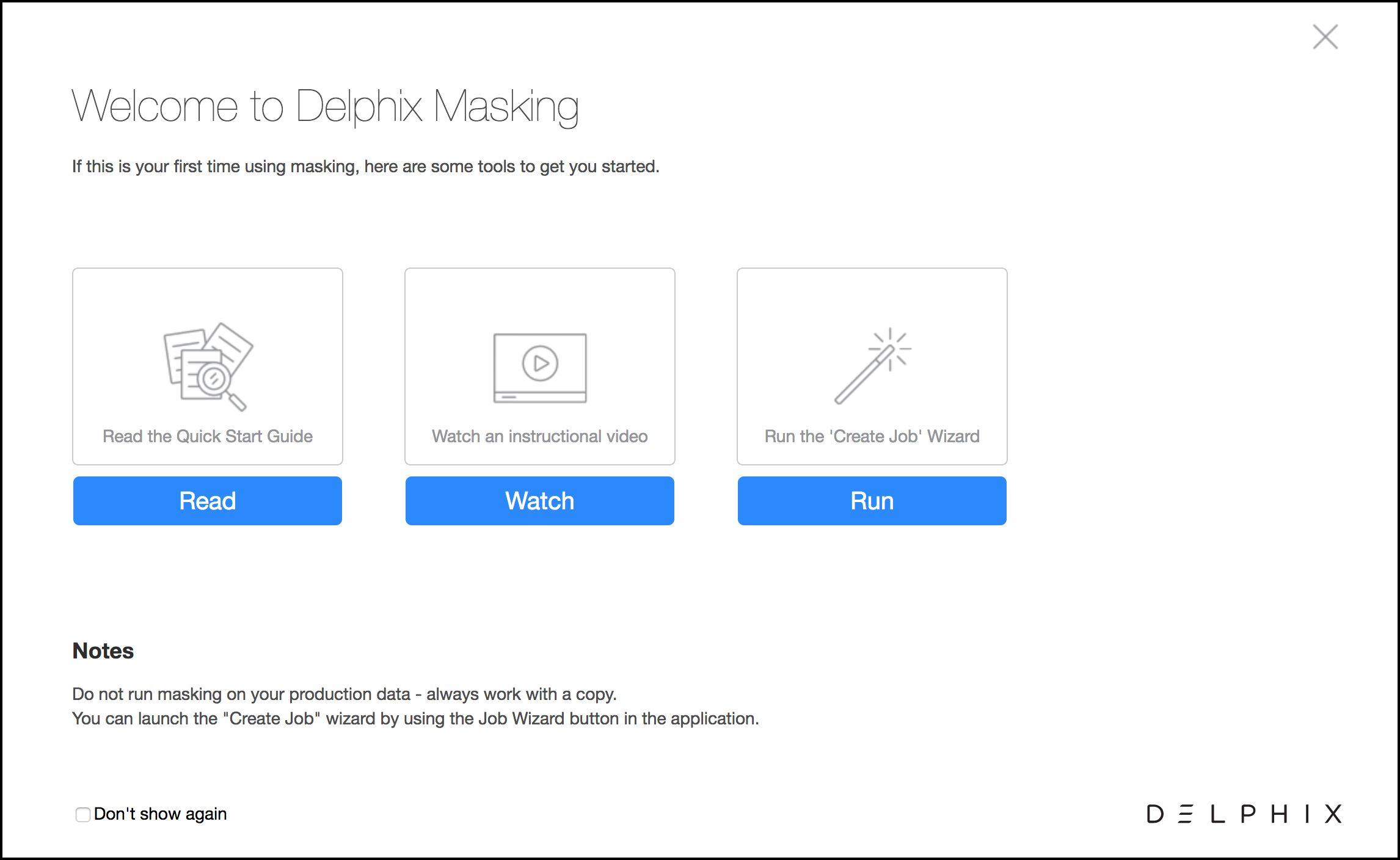 When you first login to masking, the welcome screen offers a link to learn more or begin masking immediately. To open the Job Wizard, click Run on the welcome page.