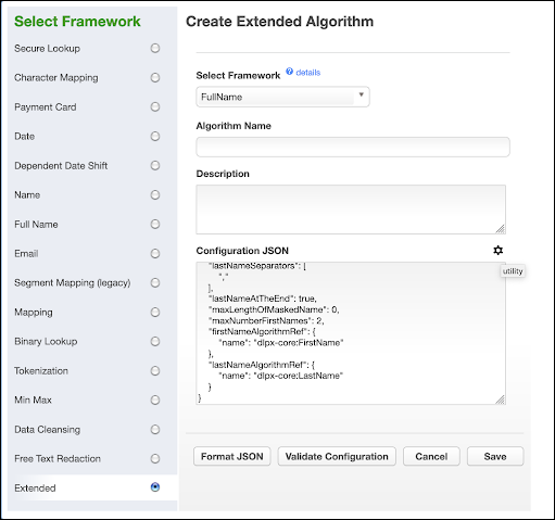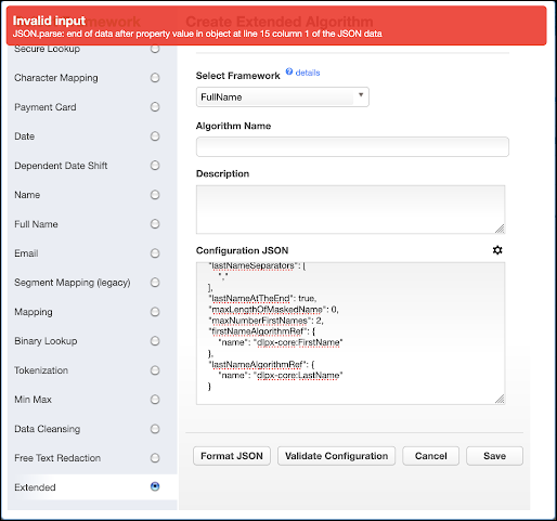 The Validate Configuration button will validate the Configuration JSON format, and also validate against the selected framework configuration schema.