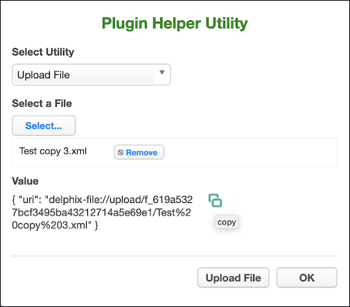 The Plugin Helper Utility offers a way to upload a file and receive a reference id for algorithm extension, or to select an instance of algorithm instances for algorithm chaining.