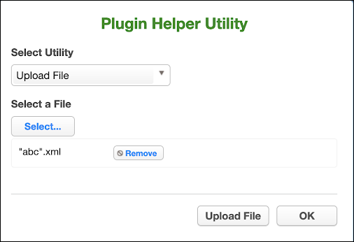 In the Plugin Helper Utility, choose Upload File from the Select Utility drop-down. Select a file to upload, then click the Upload File button.