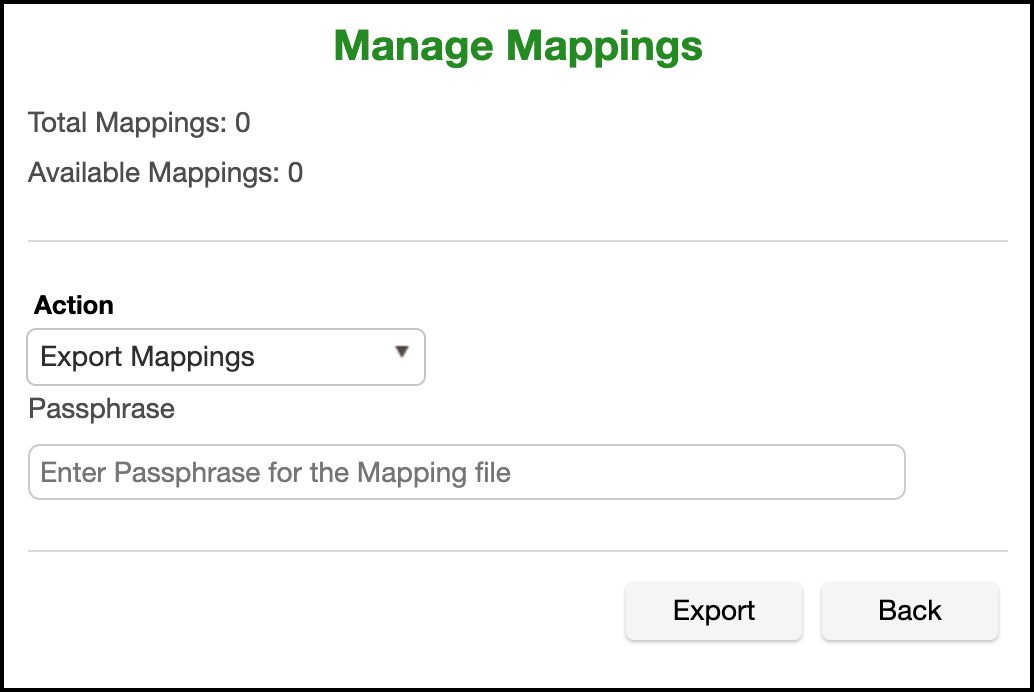 To export mappings select the Export Mappings action and provide a passphrase and then click Export.