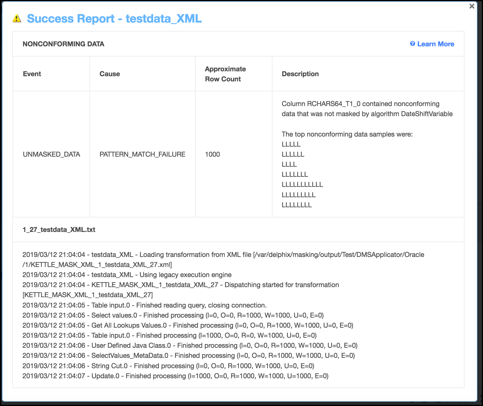The non-conformant data events are displayed followed by the masking log for the table or file. If there were no non-conformant data events, "None" is displayed under NONCONFORMING DATA, otherwise, for each type of non-conformant data, a row will be displayed with the following information: