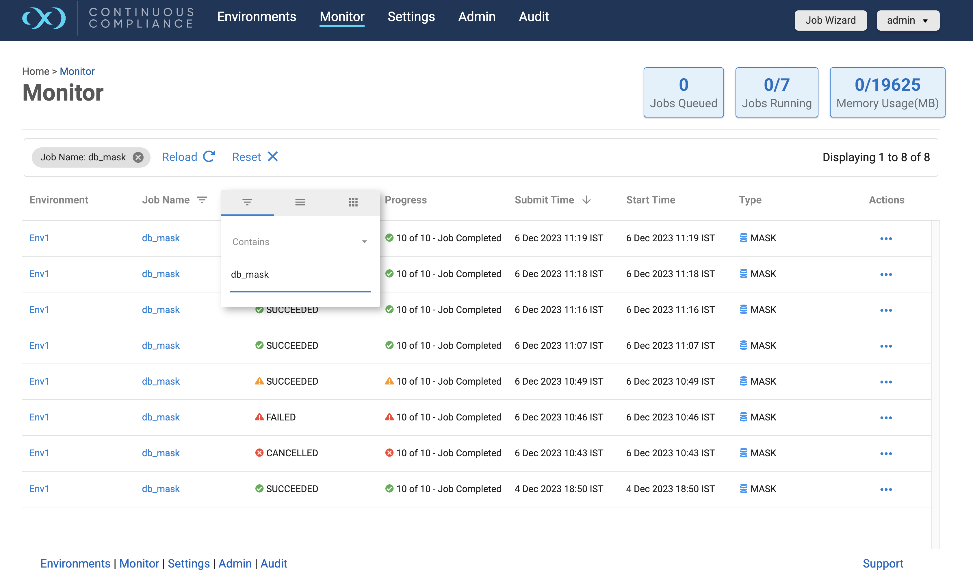 Sortable columns are: Environment, Job Name, Status, Submit Time, Start Time, Type