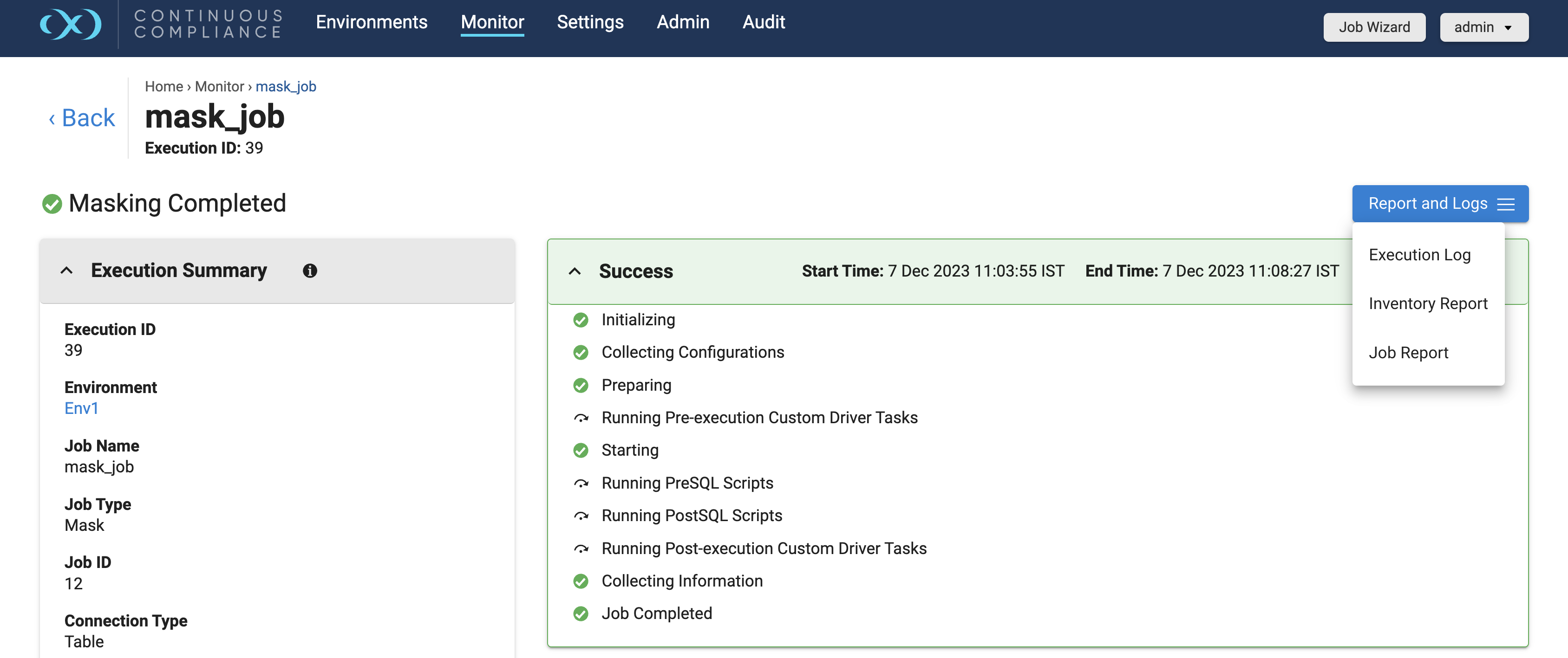 This section displays more granular information about execution including; Environment name, Connector name, Job Name, Previous run time, Number of tables/files in the job, Number of tables/files masked, Number of tables/files to be masked, Type of job, Rows remaining to mask, Rows masked, Number of streams, etc.