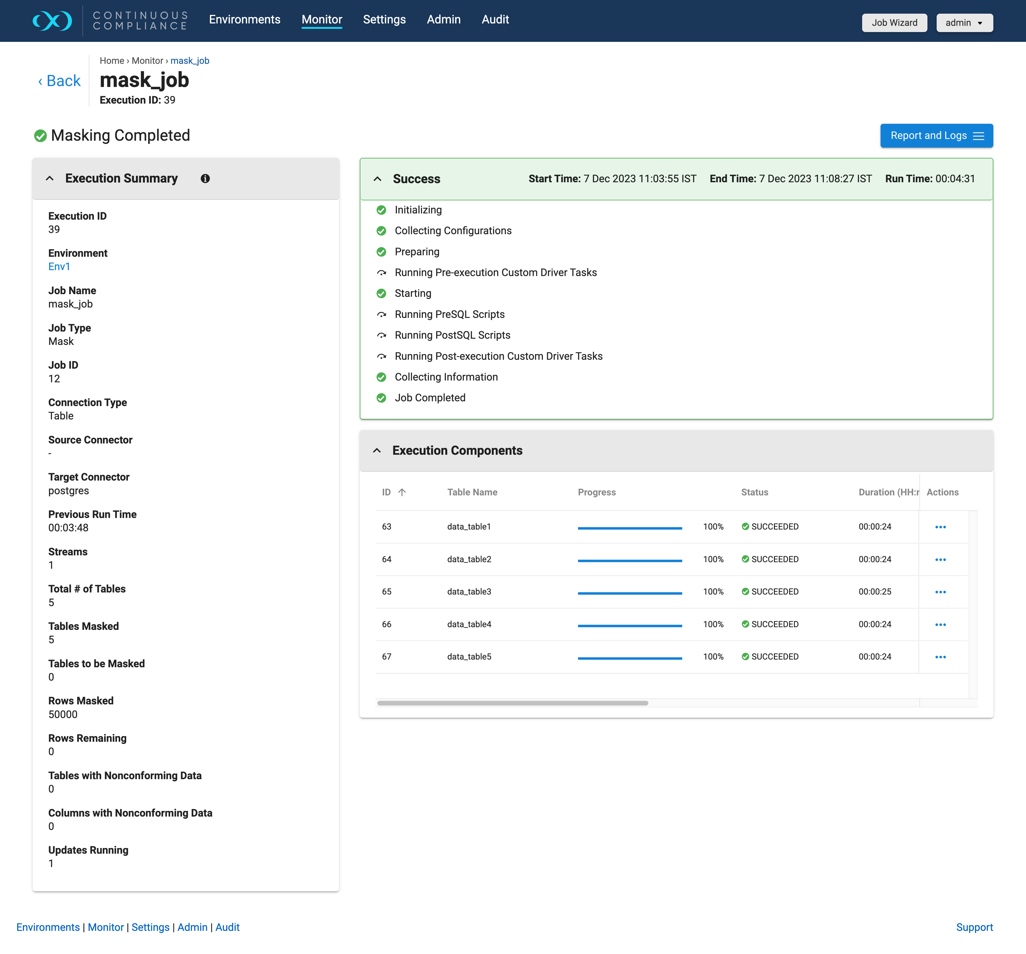 In addition to seeing this information about each job, you can look into the status/progress of each table/file defined in the job. Each table/file will be displayed under Execution Components. It includes information such as Time taken for processing, Rows Masked per Minute, Rows Masked, Rows Remaining, Number of columns/fields having Non-conformant data, etc. It also gives the option for viewing logs for individual tables/files.
