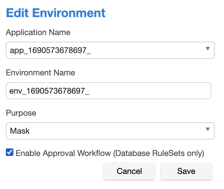 Users can enable the inventory approval workflow for any environment by selecting the checkbox “Enable Approval Workflow (database rule sets only)” at the bottom of the Add, Edit, or Copy environment dialogue boxes.