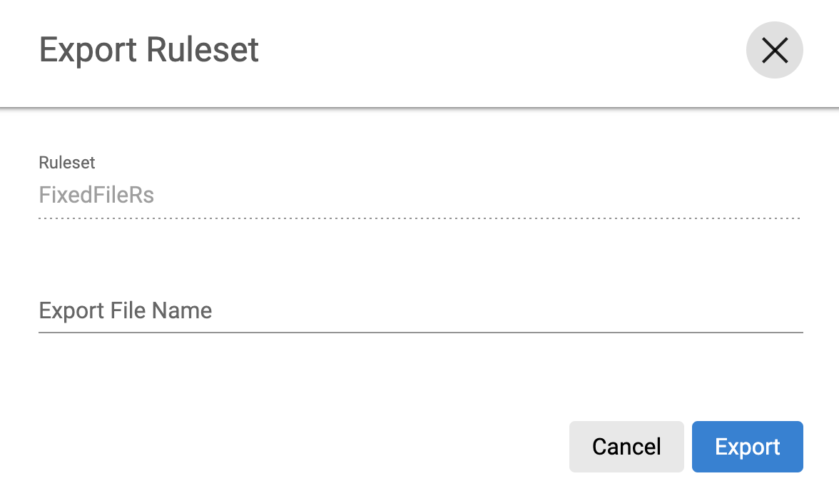 The Export Ruleset window appears with the name of the currently selected Rule Set and provide a corresponding .csv File Name to export.