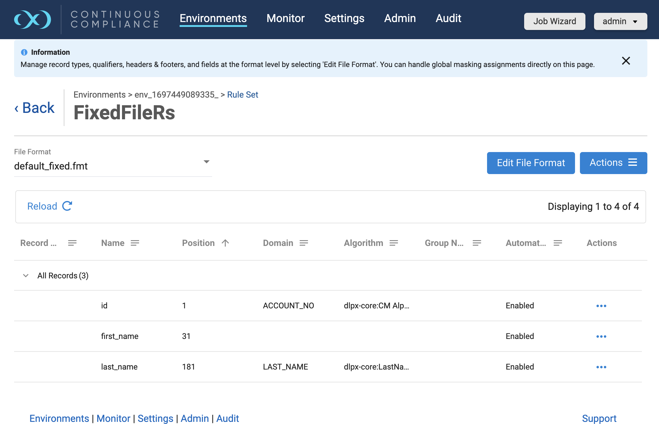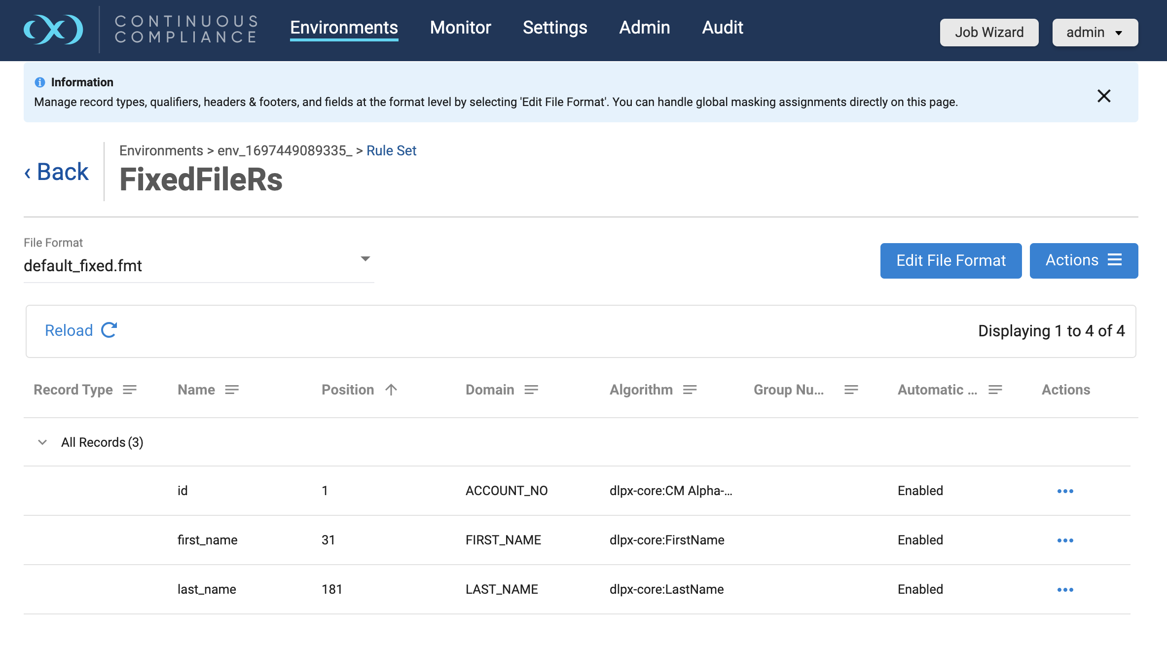 Currently, the delimited file inventory screen does not show the File Format column in the grid that indicates the document store type assignment for the field. Users can assign algorithms to the fields inside document store selected file format by either clicking on the Actions button (...) and selecting the Edit File Format option in the grid or by going to Settings > Format and choosing to Edit the assigned file format.