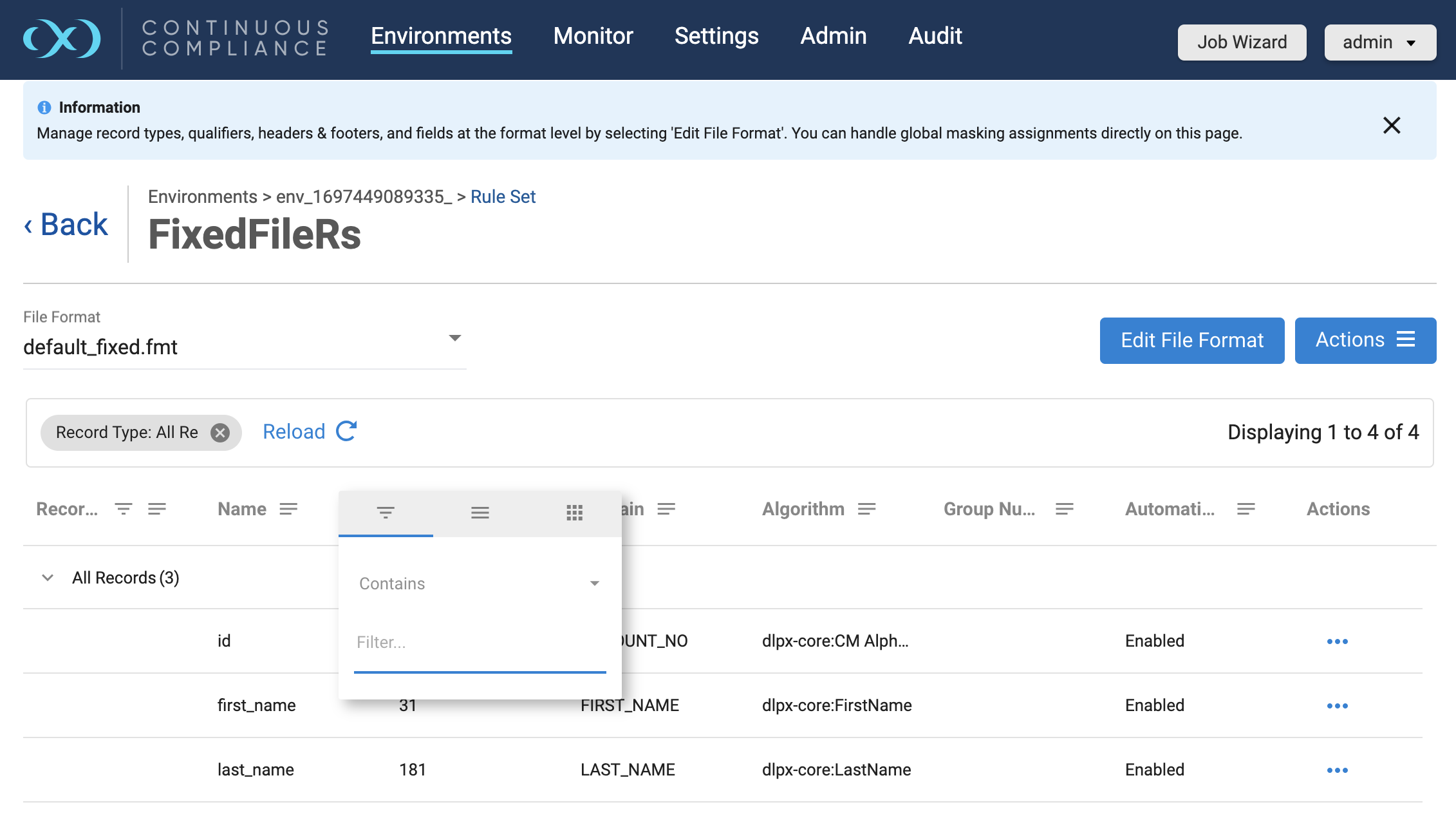 Search/select a file or file format under the File Format dropdown to create or edit the inventory of sensitive data. The Record Types and Fields for that specific file will appear in the grid below.