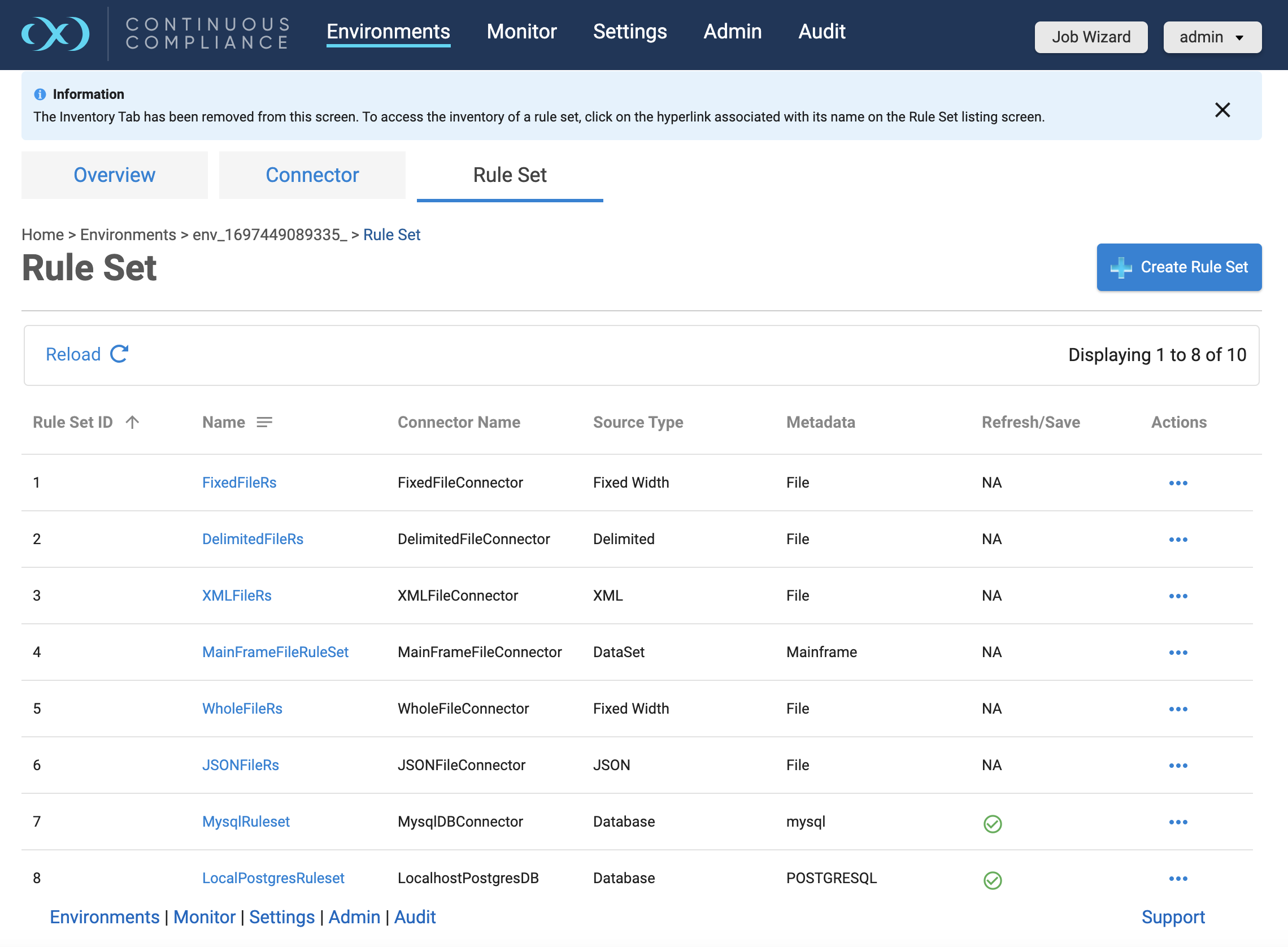 From anywhere within an environment, click on the Rule Set tab to see the rule set screen. This displays the list of rule sets for the environment. Click on Rule Set name to access the given rule set’s inventory screen.