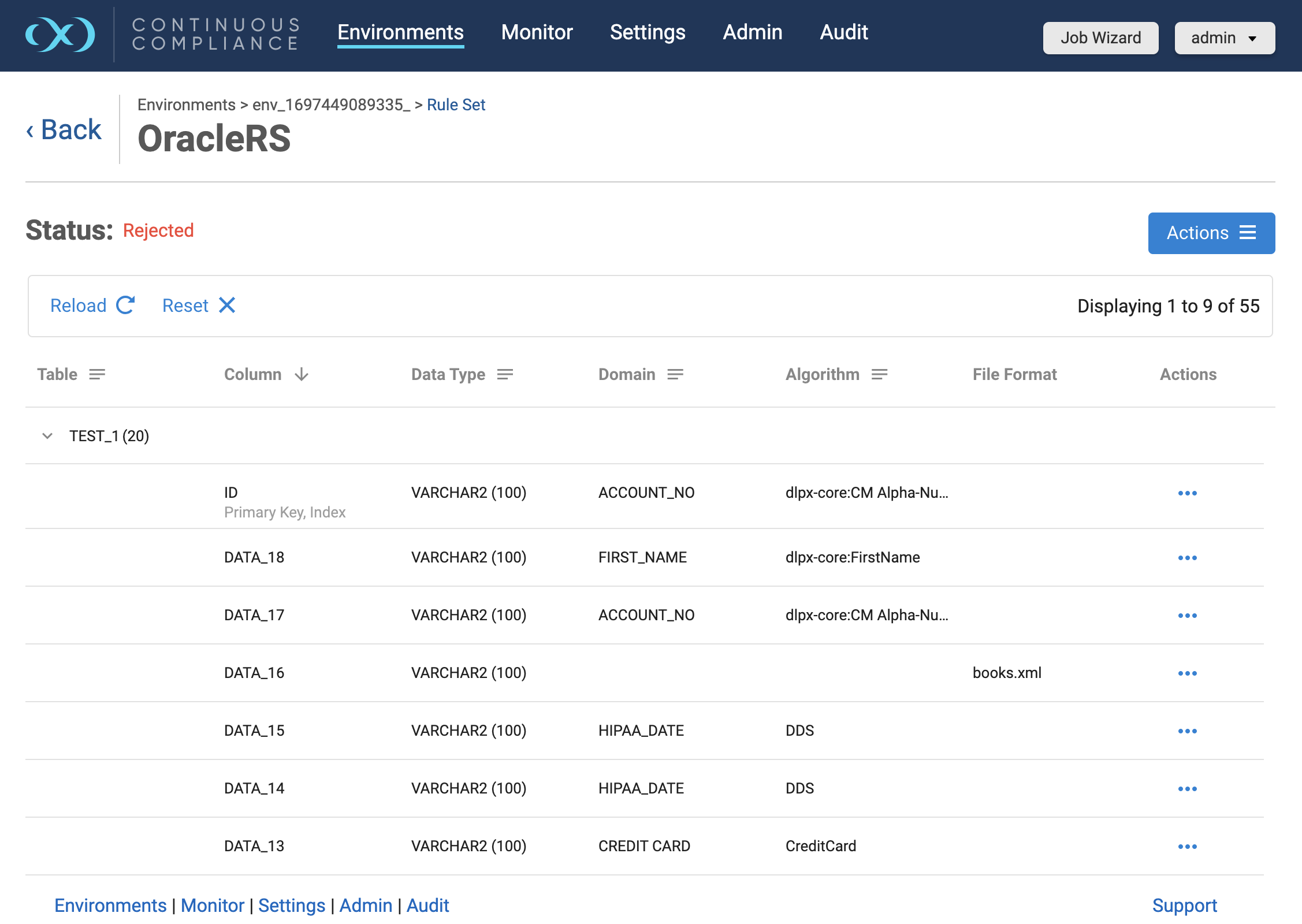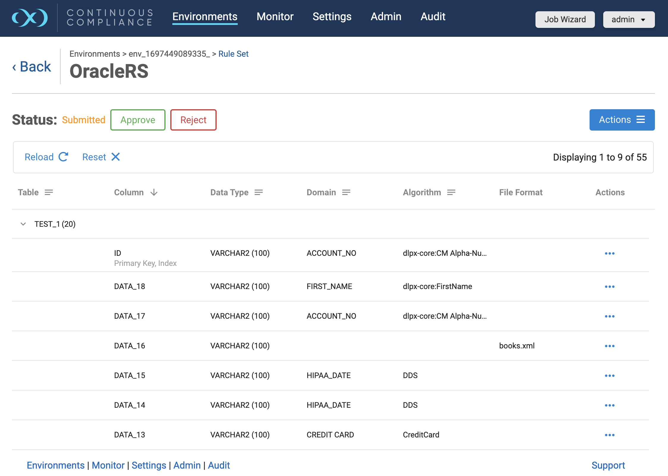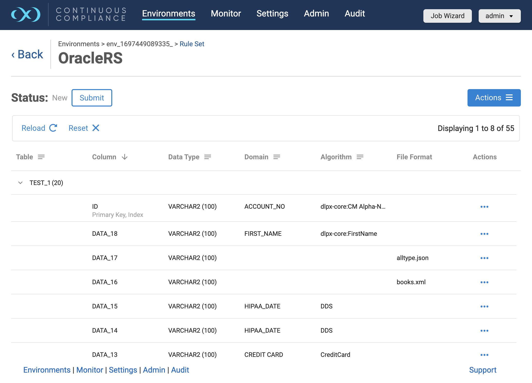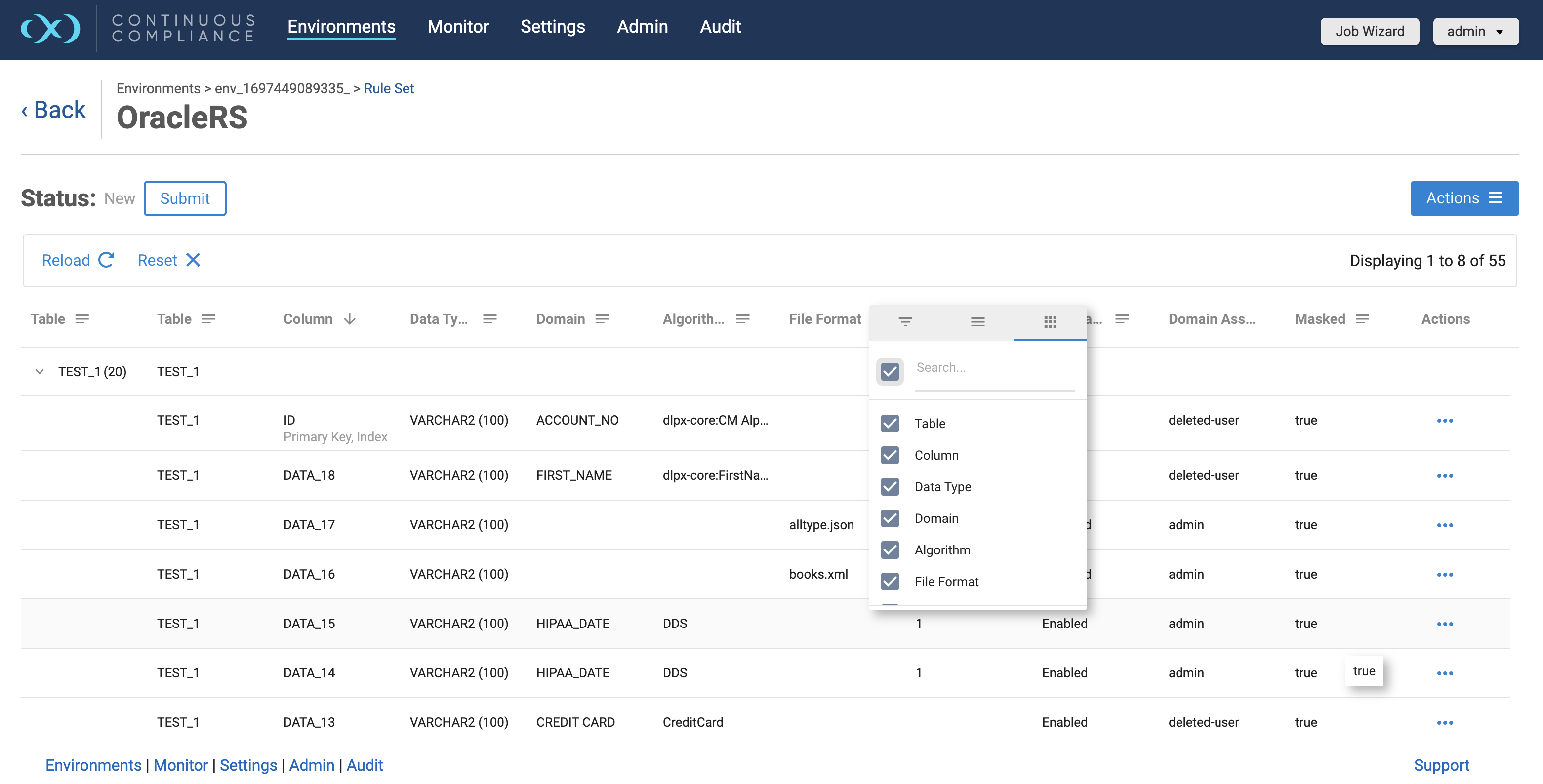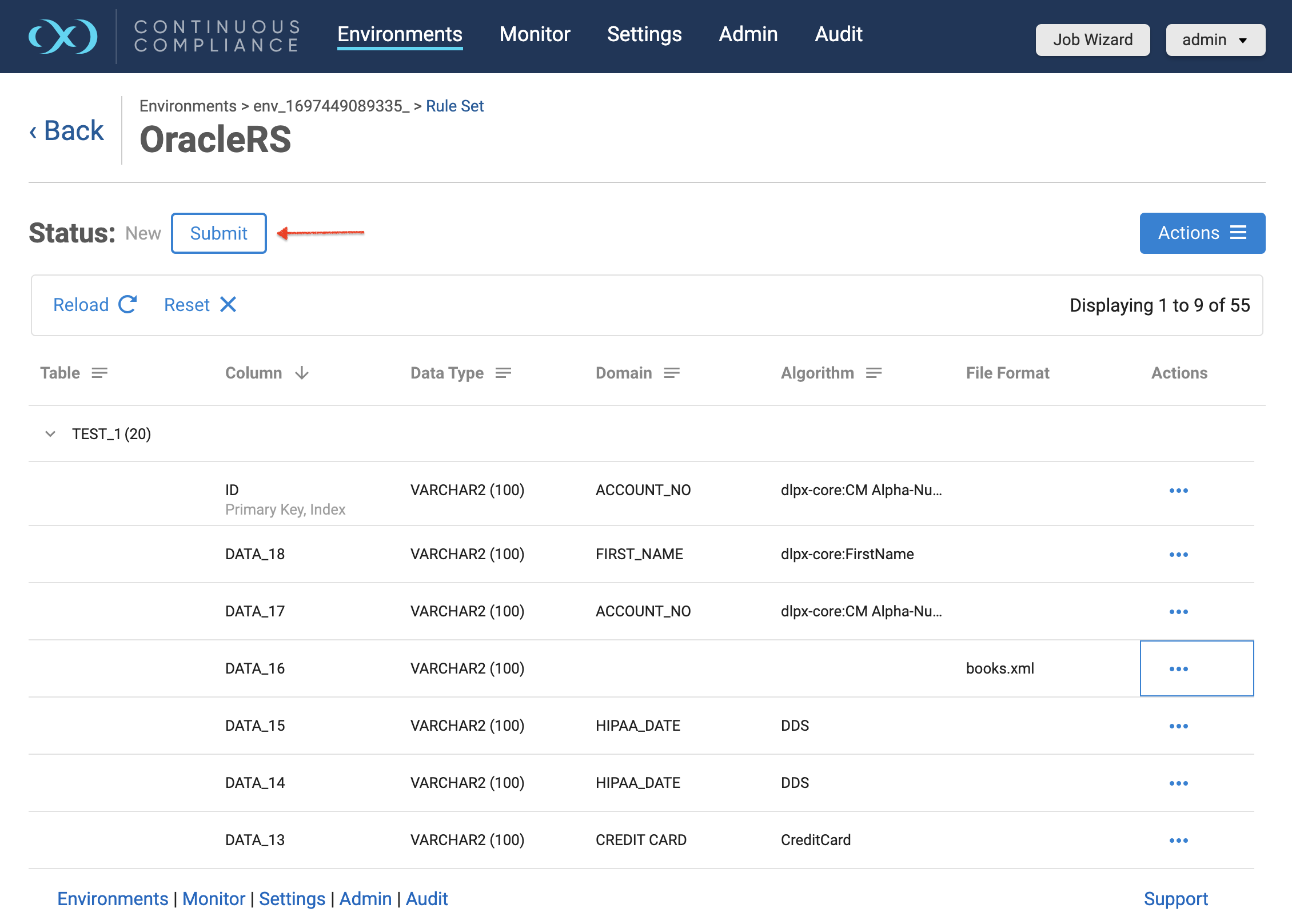 When a user updates any column properties for a database rule set, the approval workflow status will be reset to NEW for that particular rule set. A masking job will not be able to run on any rule set in this status. Users will have to submit these inventories for approval by clicking on the Submit button which appears just above the grid.