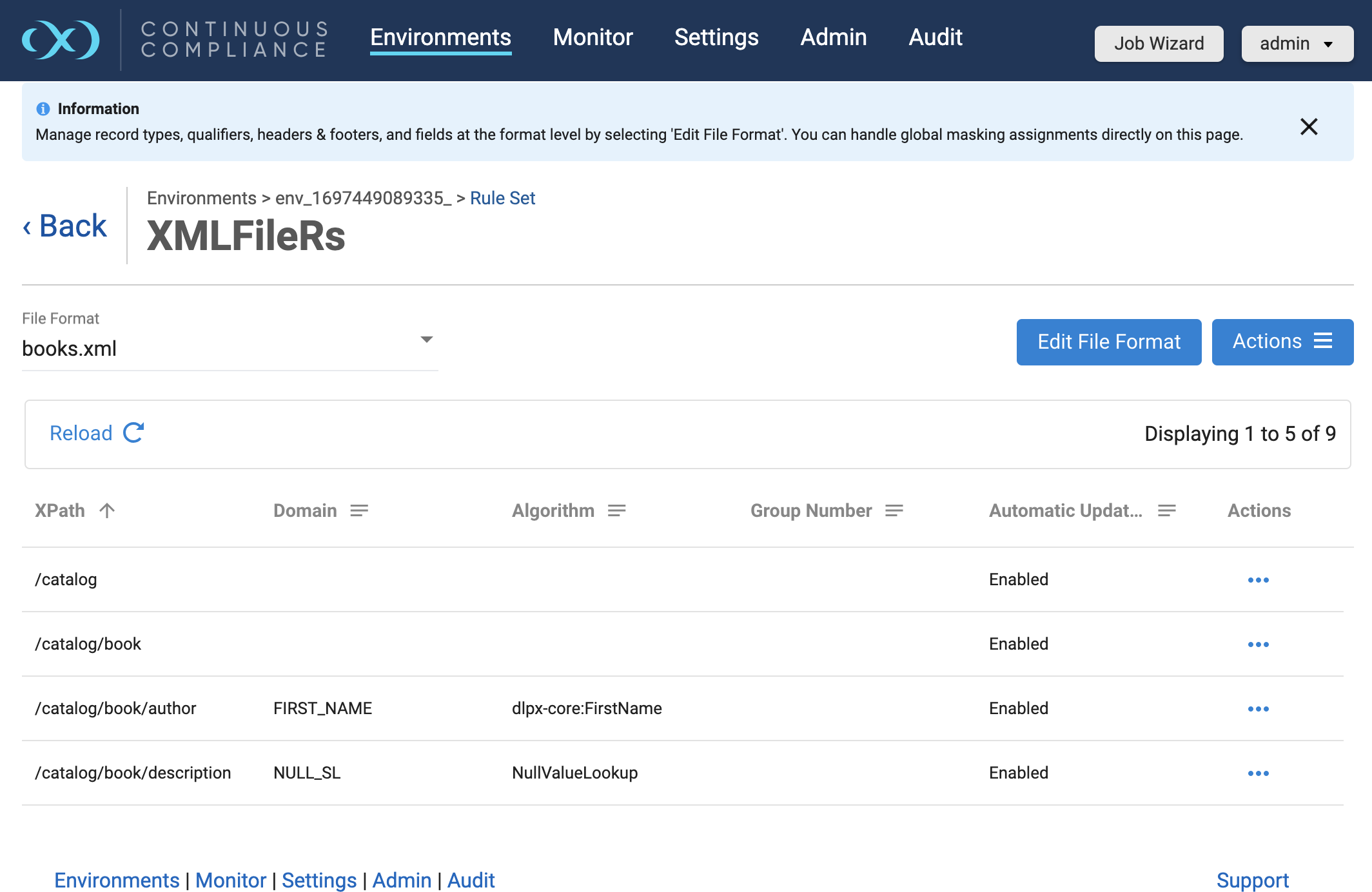 The image below shows the Inventory screen for the database rule set with a structured column. To quickly access an assigned File Format from this screen (books.xml in this example), click on the Actions button (...) and select the Edit File Format option from the dropdown.