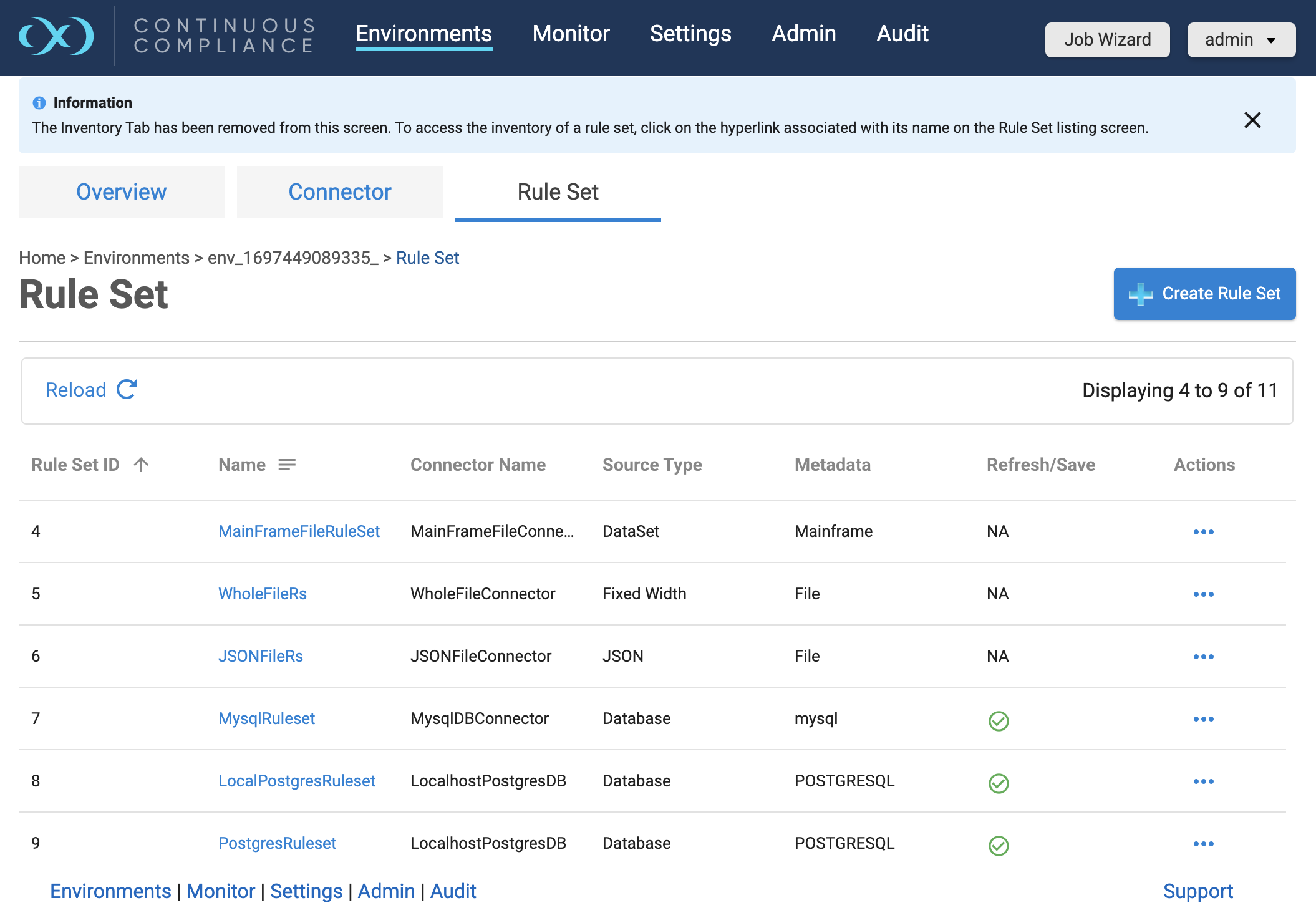 From the Rule Set tab, Click on the Actions (…) drop-down to the right of a rule set, and then select the Edit option to display the tables or files in the rule set. The rule set screen appears.