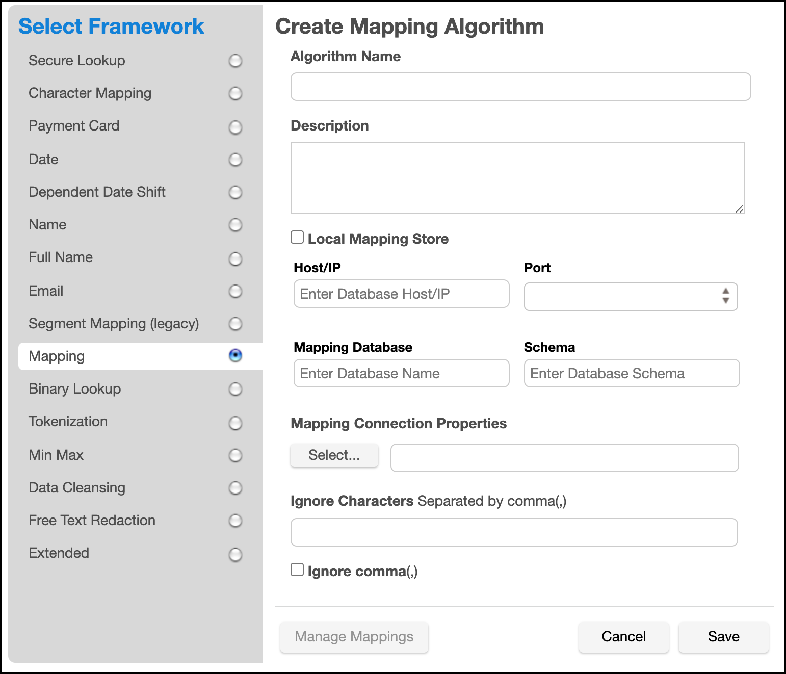 The Mapping Algorithm can be configured for mappings managed locally on the Masking Engine or remotely on a customer managed PostgreSQL database. The remote configuration should be used if the customer wishes to more easily manage the storage allocated for mappings, or if there is a desire to share the same Mapping Algorithm mappings across multiple Masking Engines. More information about remote mapping configuration can be found here.