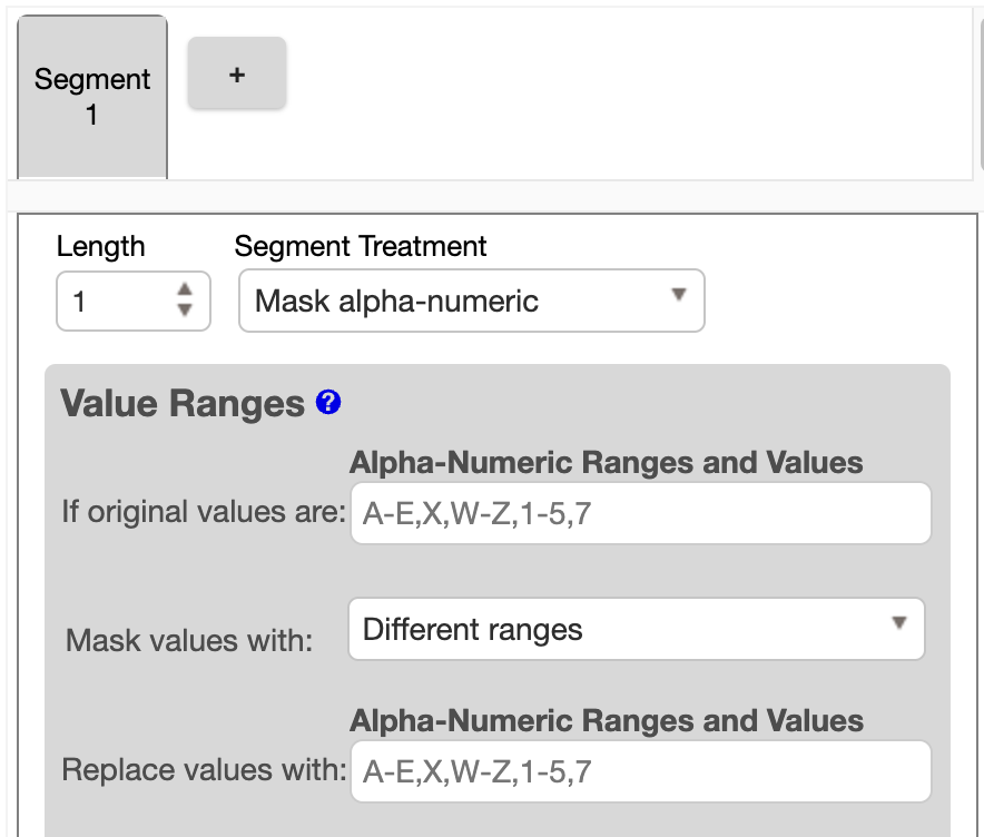 For Mask numeric, you can specify an original value range and a mask value range. If either of these fields is left blank it will use the default value range, which is 0 to the max integer that can fit into the segment length (ex: 000-999 for a segment of length 3). Use the value range fields to specify integer values and ranges, for example '10,30,50-875'.