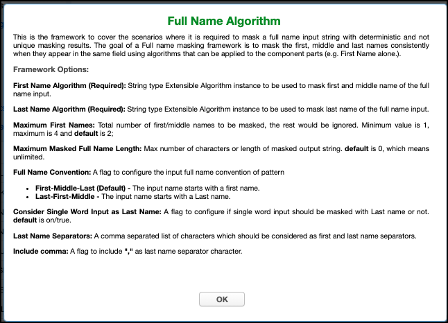 The chained instances for First Name and Last name masking can be any existing extensible algorithm instance that masks the String type. However, it is recommended to use the instances based on the Name framework. Particles can only be considered for Name framework algorithms, and it’s recommended that the First Name and Last Name algorithm instances have the same particle files.