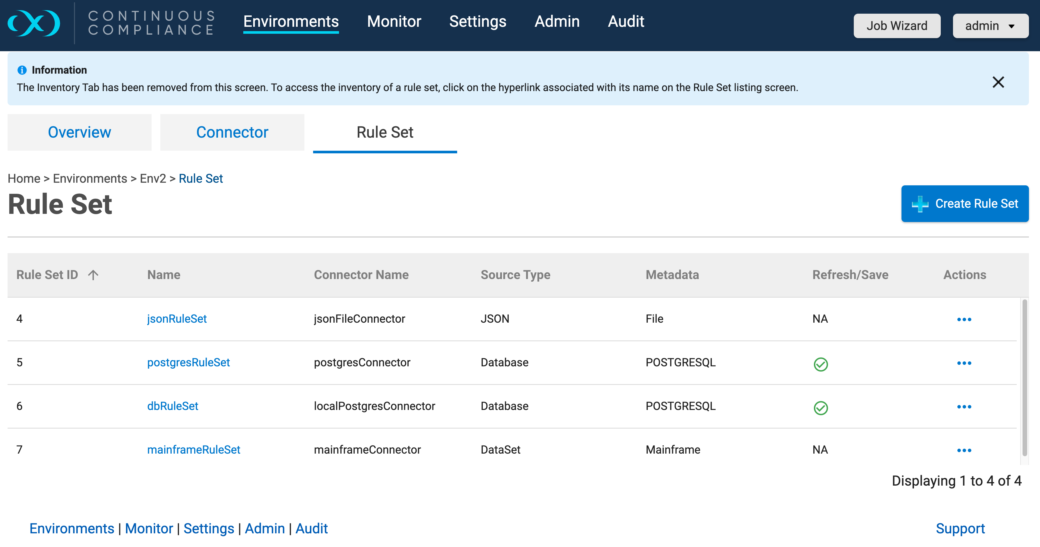 From anywhere within an Environment, click the rule set tab to display the rule sets associated with that environment. The rule sets screen appears. If you have not yet created any rule sets, the rule set list is empty.