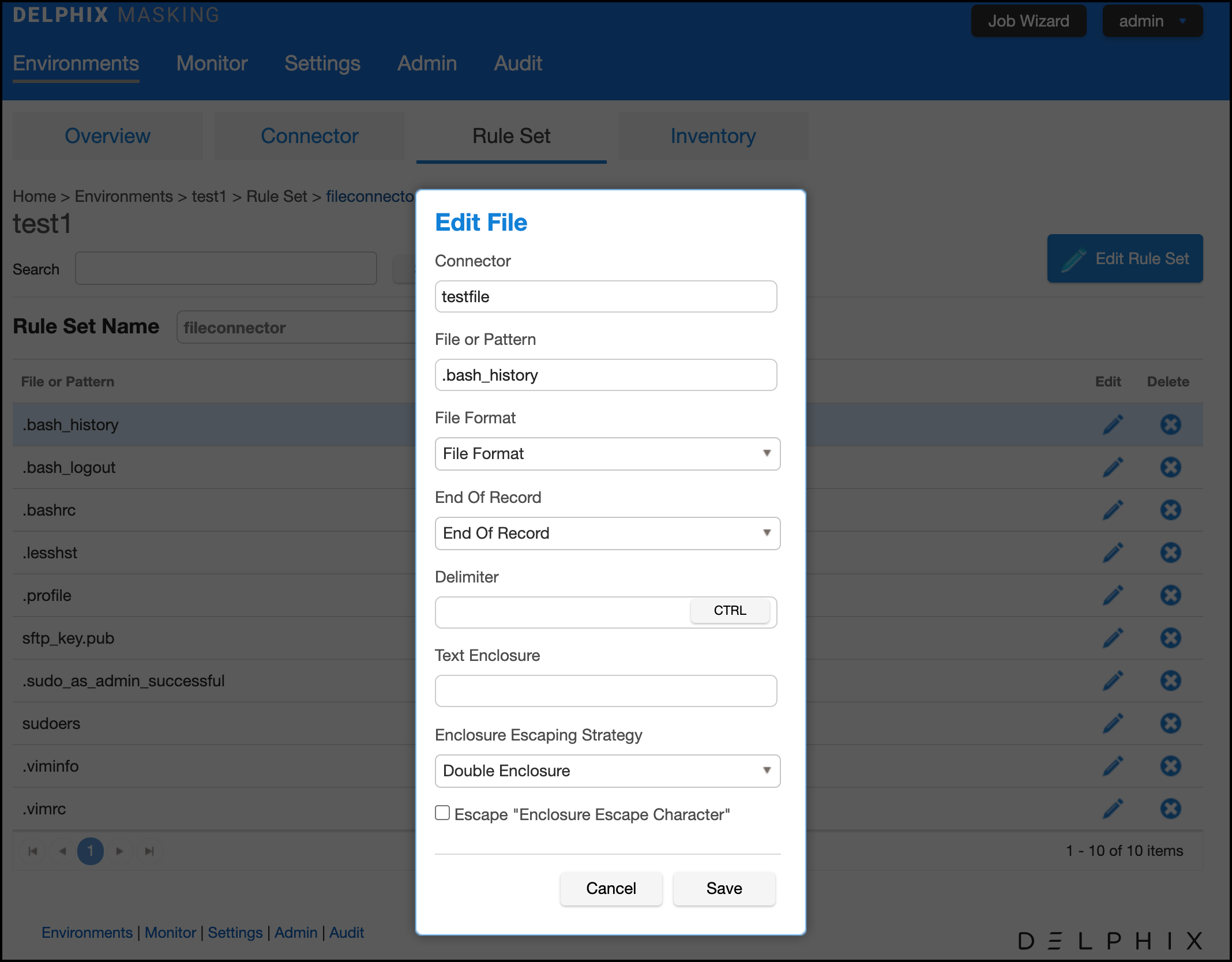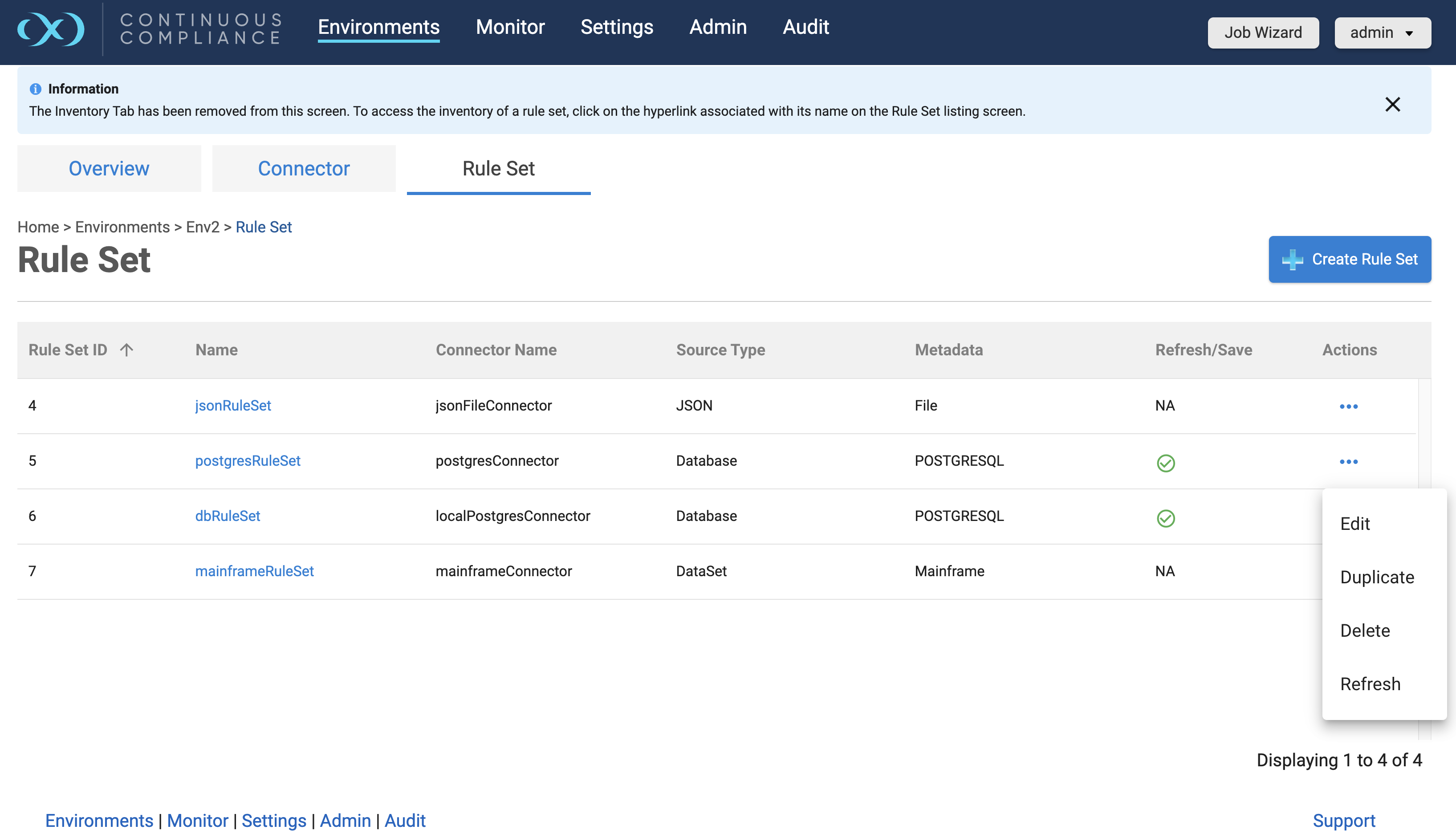 From the Rule Set tab, Click on the Actions (…) drop-down to the right of a rule set, and then select the Edit option to display the tables or files in the rule set. The rule set screen appears.