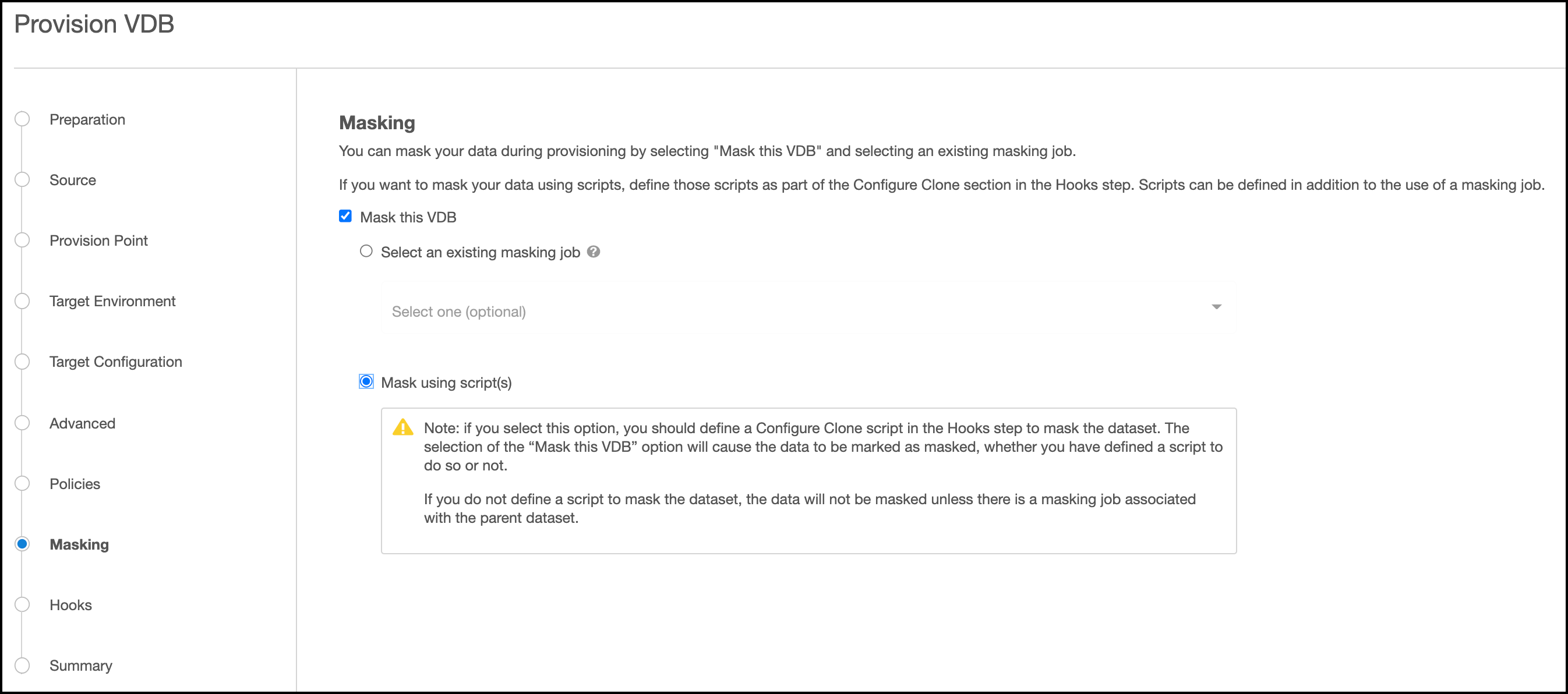 Defining Configure Clone Hooks to Mask VDB: If you choose to mask using script(s), you must define the Configure Clone Hooks to run masking jobs yourself. If you don't define any Configure Clone hooks in the Hooks step, the data will be marked as masked, but it will not be masked.