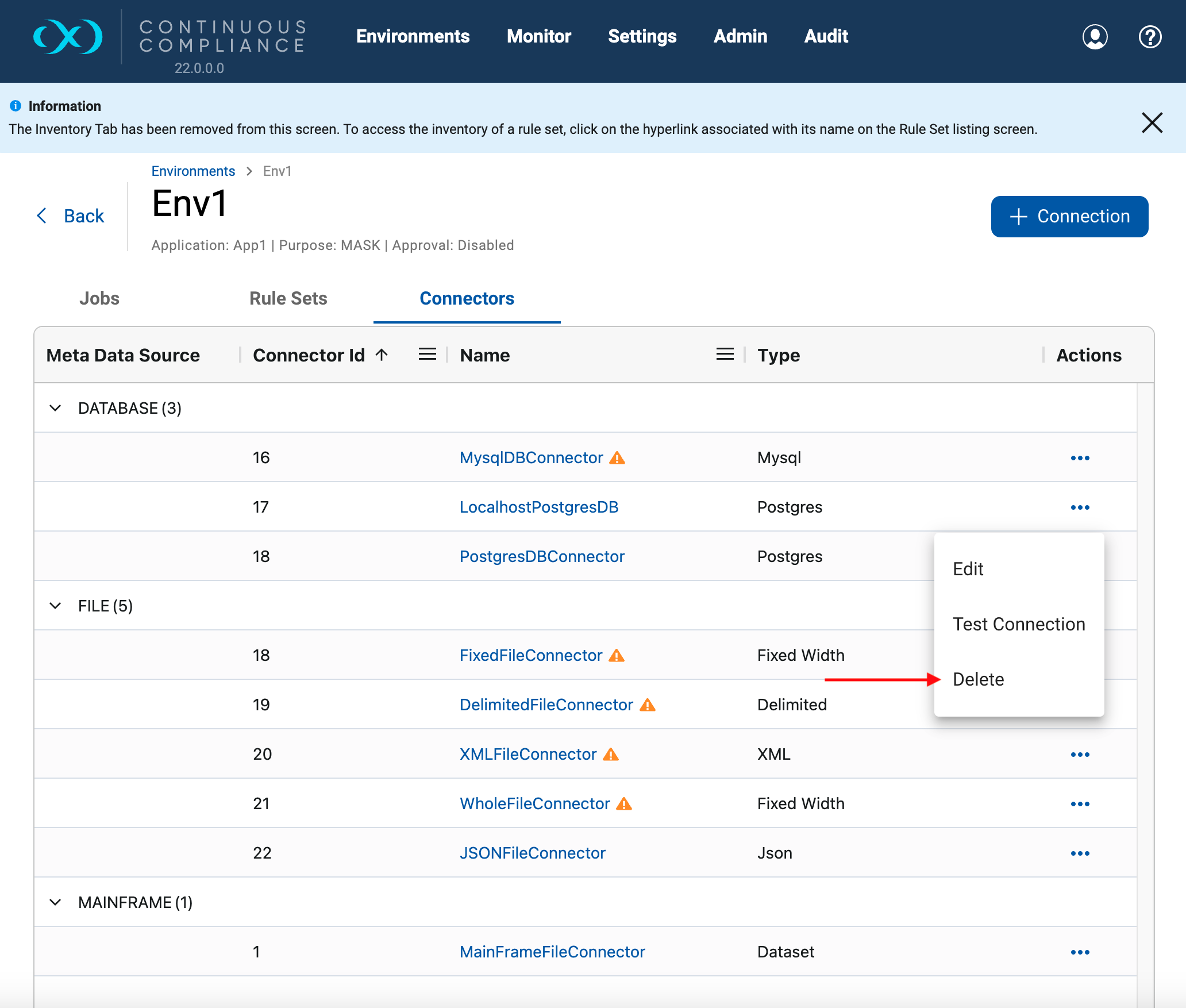 To delete a connector, click Delete under the action icon. When you delete a connector, you also delete its rule sets and inventory data.