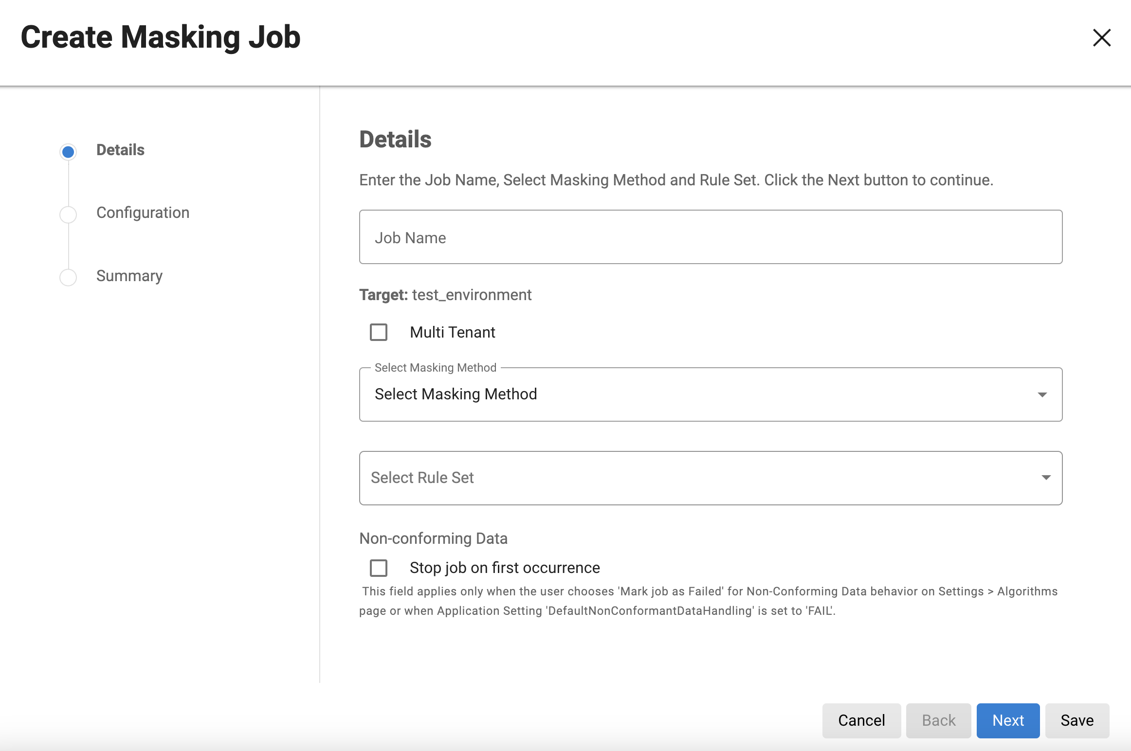 Click the Add Masking Job button at the top of the page, then the Create Masking Job window will appear.