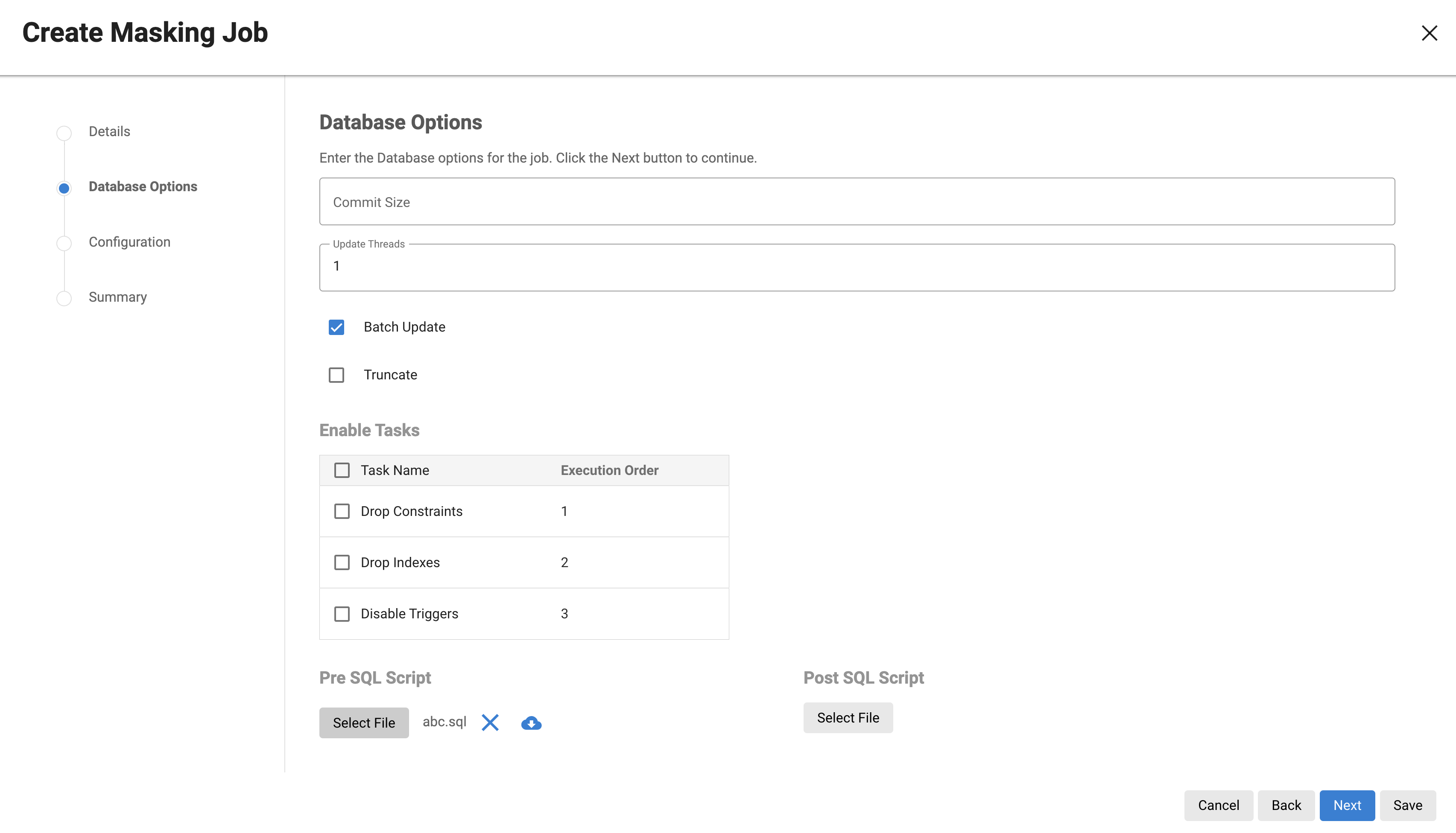 Enable Tasks (optional): It displays tasks implemented by the driver support plugin being used. The default is for each checkbox to not be selected and therefore not perform any of the tasks. If the masking job being created is for a built-in connector with a built-in driver support plugin, the options displayed will be Disable Constraints, Disable Triggers, and Drop Indexes. For a full list of supported built-in connectors and information on specific built-in driver support plugins, see Built-in Driver Supports.