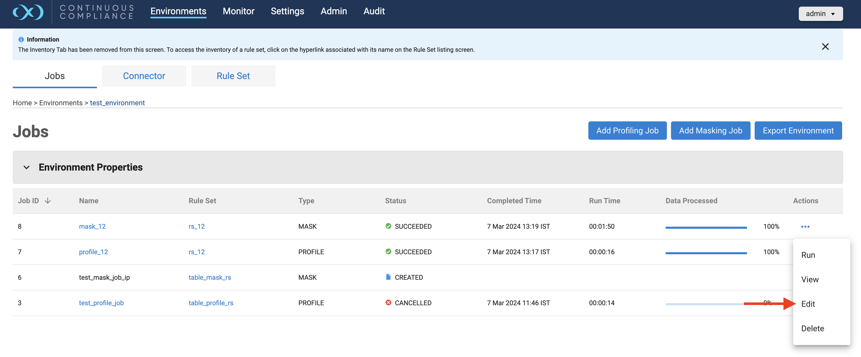 To perform an edit action on any of the Masking jobs, Click the (…) button to the right of the corresponding row under the Actions column, Edit action will be visible. If the user doesn’t have permission to edit the job, then it will be disabled.