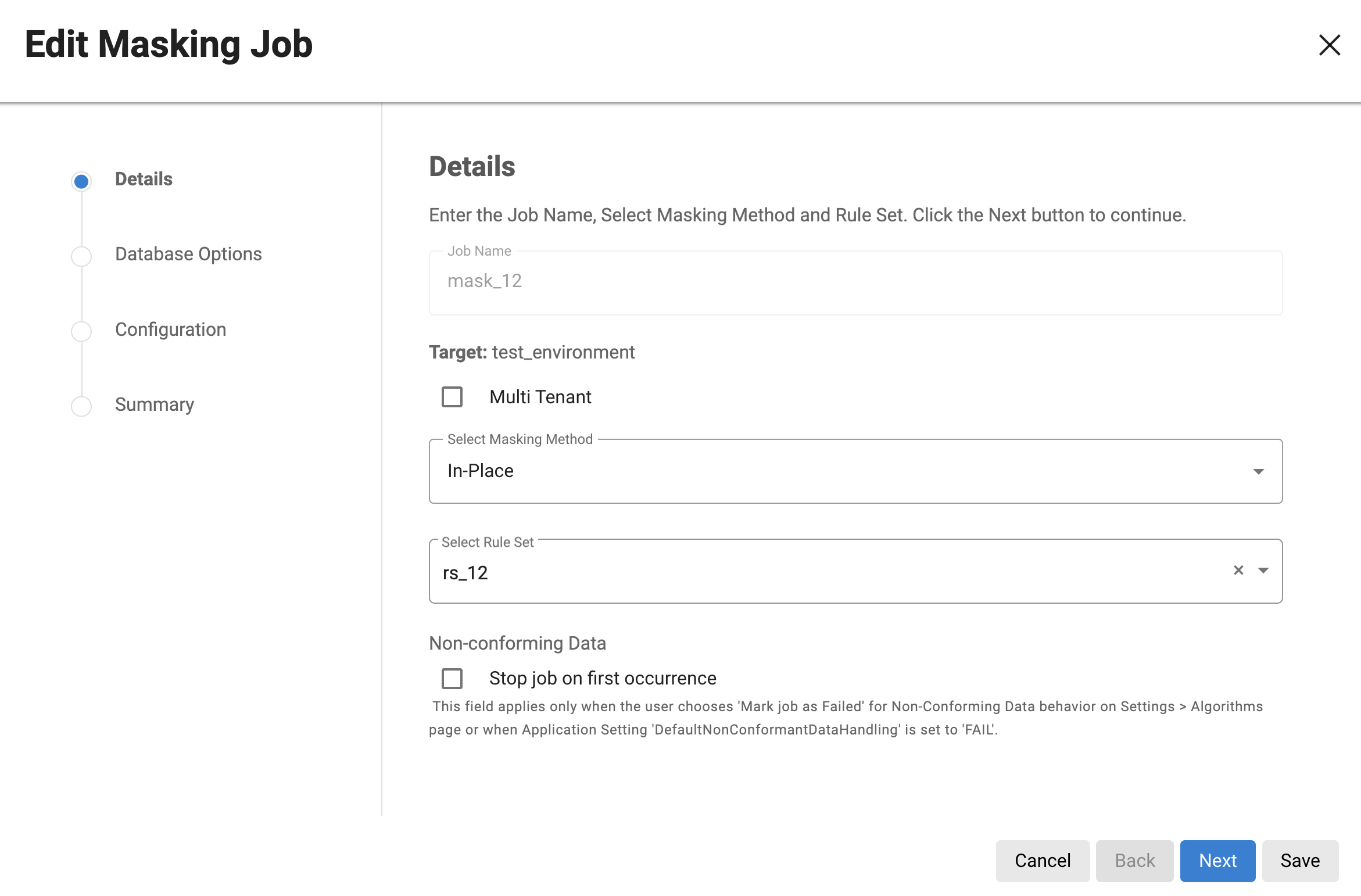 On clicking Edit action, a wizard will appear for editing the Masking job. The job name is not editable after creation hence it will be disabled for Editing. For other fields, the user can edit and save.